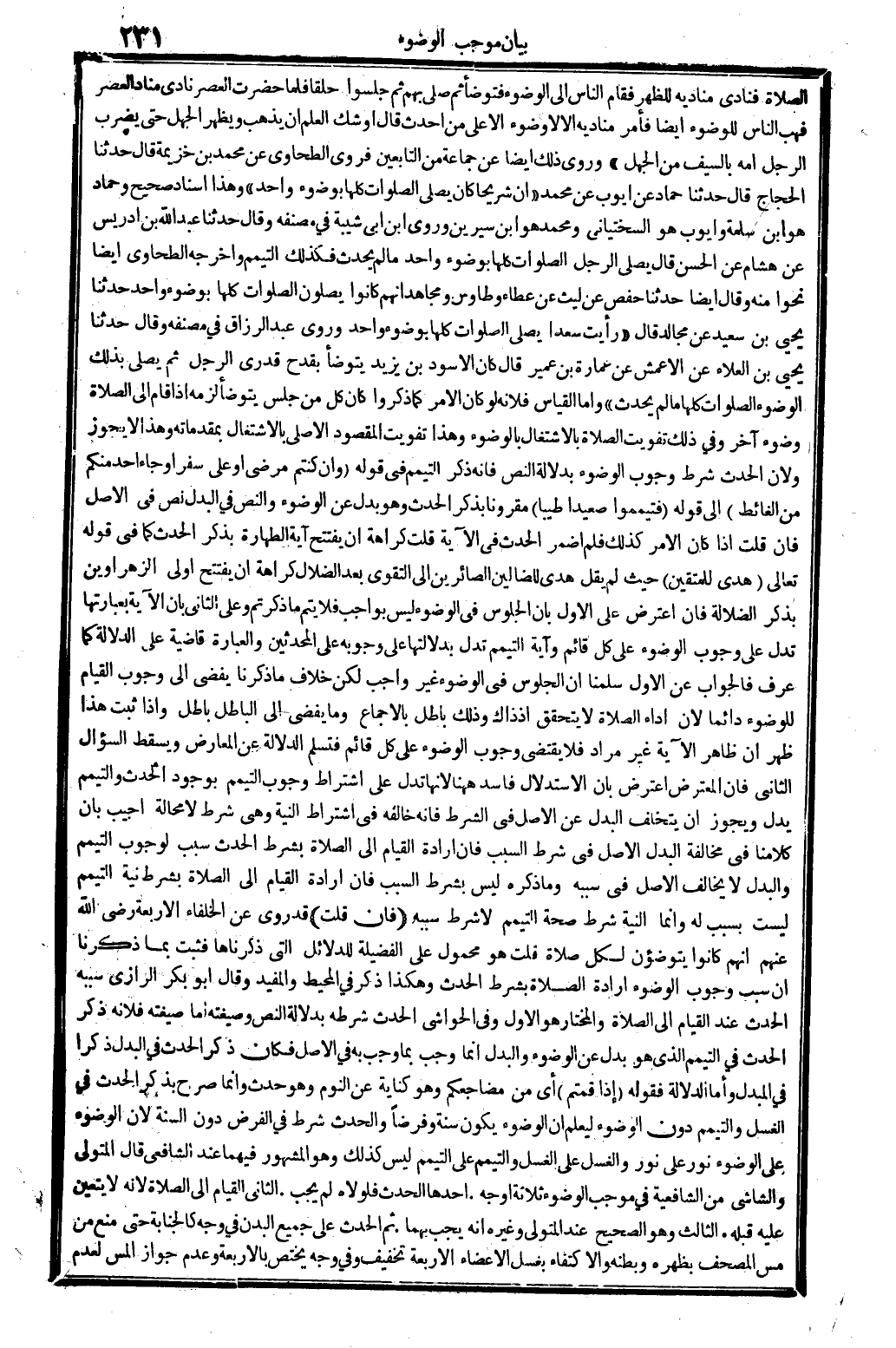 الصَّلَاة فَنَادَى مناديه لِلظهْرِ فَقَامَ النَّاس إِلَى الْوضُوء فَتَوَضَّأ ثمَّ صلى بهم ثمَّ جَلَسُوا حلقا فَلَمَّا حضرت الْعَصْر نَادَى مُنَاد الْعَصْر فَهَب النَّاس للْوُضُوء أَيْضا فَأمر مناديه أَلا لَا وضوء إِلَّا على من أحدث قَالَ أوشك الْعلم أَن يذهب وَيظْهر الْجَهْل حَتَّى يضْرب الرجل أمه بِالسَّيْفِ من الْجَهْل وروى ذَلِك أَيْضا عَن جمَاعَة من التَّابِعين فروى الطَّحَاوِيّ عَن مُحَمَّد بن خُزَيْمَة قَالَ حَدثنَا الْحجَّاج قَالَ حَدثنَا حَمَّاد عَن أَيُّوب عَن مُحَمَّد أَن شريحا كَانَ يُصَلِّي الصَّلَوَات كلهَا بِوضُوء وَاحِد وَهَذَا إِسْنَاد صَحِيح وَحَمَّاد هُوَ ابْن سَلمَة وَأَيوب هُوَ السّخْتِيَانِيّ وَمُحَمّد هُوَ ابْن سِيرِين وروى ابْن أبي شيبَة فِي مُصَنفه وَقَالَ حَدثنَا عبد الله بن إِدْرِيس عَن هِشَام عَن الْحسن قَالَ يُصَلِّي الرجل الصَّلَوَات كلهَا بِوضُوء وَاحِد مَا لم يحدث فَكَذَلِك التَّيَمُّم وَأخرجه الطَّحَاوِيّ أَيْضا نَحوا مِنْهُ وَقَالَ أَيْضا حَدثنَا حَفْص عَن لَيْث عَن عَطاء وَطَاوُس وَمُجاهد أَنهم كَانُوا يصلونَ الصَّلَوَات كلهَا بِوضُوء وَاحِد حَدثنَا يحيى بن سعيد عَن مجَالد قَالَ رَأَيْت سَعْدا يُصَلِّي الصَّلَوَات كلهَا بِوضُوء وَاحِد وروى عبد الرَّزَّاق فِي مُصَنفه وَقَالَ حَدثنَا يحيى بن الْعَلَاء عَن الْأَعْمَش عَن عمَارَة بن عُمَيْر قَالَ كَانَ الْأسود بن يزِيد يتَوَضَّأ بقدح قدري الرجل ثمَّ يُصَلِّي بذلك الْوضُوء الصَّلَوَات كلهَا مَا لم يحدث وَأما الْقيَاس فَلِأَنَّهُ لَو كَانَ الْأَمر كَمَا ذكرُوا كَانَ كل من جلس يتَوَضَّأ لزمَه إِذا قَامَ إِلَى الصَّلَاة وضوء آخر وَفِي ذَلِك تَفْوِيت الصَّلَاة بالاشتغال بِالْوضُوءِ وَهَذَا تَفْوِيت الْمَقْصُود الْأَصْلِيّ بالاشتغال بمقدماته وَهَذَا لَا يجوز وَلِأَن الْحَدث شَرط وجوب الْوضُوء بِدلَالَة النَّص فَإِنَّهُ ذكر التَّيَمُّم فِي قَوْله {وَإِن كُنْتُم مرضى أَو على سفر أَو جَاءَ أحد مِنْكُم من الْغَائِط} إِلَى قَوْله {فَتَيَمَّمُوا صَعِيدا طيبا} مَقْرُونا بِذكر الْحَدث وَهُوَ بدل عَن الْوضُوء وَالنَّص فِي الْبَدَل نَص فِي الأَصْل فَإِن قلت إِذا كَانَ الْأَمر كَذَلِك فَلم أضمر الْحَدث فِي الْآيَة قلت كَرَاهَة أَن يفْتَتح آيَة الطَّهَارَة بِذكر الْحَدث كَمَا فِي قَوْله تَعَالَى {هدى لِلْمُتقين} حَيْثُ لم يقل هدى للضالين الصائرين إِلَى التَّقْوَى بعد الضلال كَرَاهَة أَن يفْتَتح أولى الزهراوين بِذكر الضَّلَالَة فَإِن اعْترض على الأول بِأَن الْجُلُوس فِي الْوضُوء لَيْسَ بِوَاجِب فَلَا يتم مَا ذكرْتُمْ وعَلى الثَّانِي بِأَن الْآيَة بعبارتها تدل على وجوب الْوضُوء على كل قَائِم وَآيَة التَّيَمُّم تدل بدلالتها على وُجُوبه على الْمُحدثين والعبارة قاضية على الدّلَالَة كَمَا عرف فَالْجَوَاب عَن الأول سلمنَا أَن الْجُلُوس فِي الْوضُوء غير وَاجِب لَكِن خلاف مَا ذكرنَا يُفْضِي إِلَى وجوب الْقيام للْوُضُوء دَائِما لِأَن أَدَاء الصَّلَاة لَا يتَحَقَّق إِذْ ذَاك وَذَلِكَ بَاطِل بِالْإِجْمَاع وَمَا يُفْضِي إِلَى الْبَاطِل بَاطِل وَإِذا ثَبت هَذَا ظهر أَن ظَاهر الْآيَة غير مُرَاد فَلَا يَقْتَضِي وجوب الْوضُوء على كل قَائِم فتسلم الدّلَالَة عَن الْمعَارض وَيسْقط السُّؤَال الثَّانِي فَإِن الْمُعْتَرض اعْترض بِأَن الِاسْتِدْلَال فَاسد هَهُنَا لِأَنَّهَا تدل على اشْتِرَاط وجوب التَّيَمُّم بِوُجُود الْحَدث وَالتَّيَمُّم يدل وَيجوز أَن يتَخَلَّف الْبَدَل عَن الأَصْل فِي الشَّرْط فَإِنَّهُ خَالفه فِي اشْتِرَاط النِّيَّة وَهِي شَرط لَا محَالة أُجِيب بِأَن كلامنا فِي مُخَالفَة الْبَدَل الأَصْل فِي شَرط السَّبَب فَإِن إِرَادَة الْقيام إِلَى الصَّلَاة بِشَرْط الْحَدث سَبَب لوُجُوب التَّيَمُّم وَالْبدل لَا يُخَالف الأَصْل فِي س