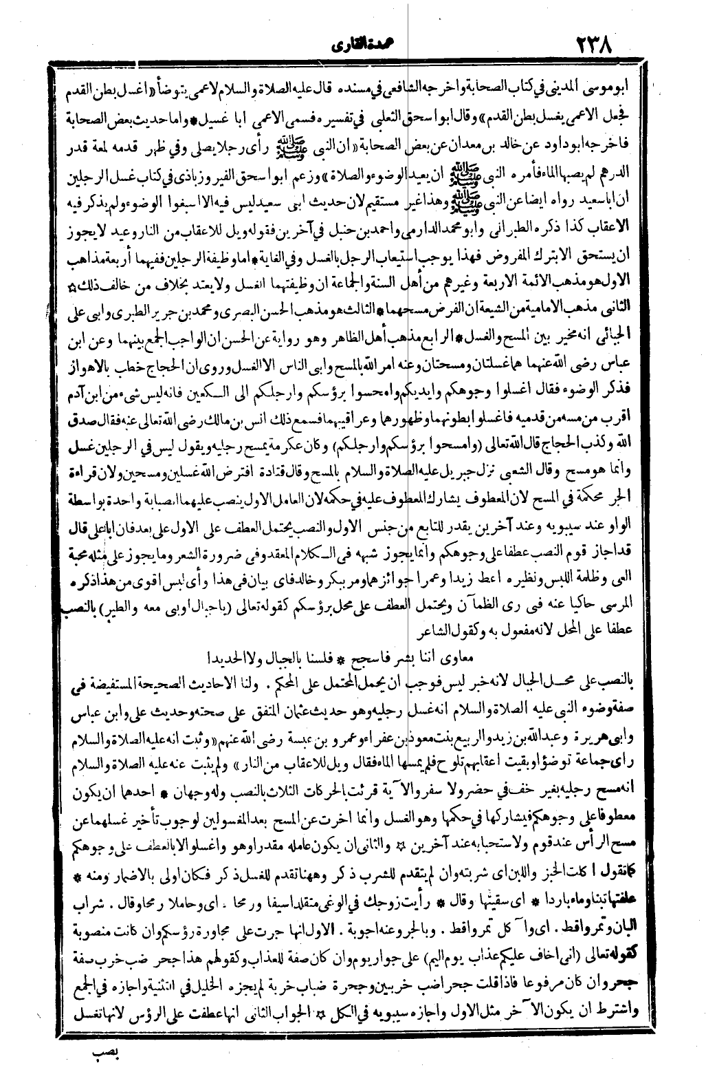أَبُو مُوسَى الْمَدِينِيّ فِي كتاب الصَّحَابَة وَأخرجه الشَّافِعِي فِي مُسْنده قَالَ عَلَيْهِ الصَّلَاة وَالسَّلَام لأعمى يتَوَضَّأ اغسل بطن الْقدَم فَجعل الْأَعْمَى يغسل بطن الْقدَم وَقَالَ أَبُو إِسْحَق الثَّعْلَبِيّ فِي تَفْسِيره فَسمى الْأَعْمَى أَبَا غسيل وَأما حَدِيث بعض الصَّحَابَة فَأخْرجهُ أَبُو دَاوُد عَن خَالِد بن معدان عَن بعض الصَّحَابَة أَن النَّبِي صلى الله عَلَيْهِ وَسلم رأى رجلا يُصَلِّي وَفِي ظهر قدمه لمْعَة قدر الدِّرْهَم لم يصبهَا المَاء فَأمره النَّبِي صلى الله عَلَيْهِ وَسلم أَن يُعِيد الْوضُوء وَالصَّلَاة وَزعم أَبُو إِسْحَق الفيروزباذي فِي كتاب غسل الرجلَيْن أَن أَبَا سعيد رَوَاهُ أَيْضا عَن النَّبِي صلى الله عَلَيْهِ وَسلم وَهَذَا غير مُسْتَقِيم لِأَن حَدِيث أبي سعيد لَيْسَ فِيهِ إِلَّا أَسْبغُوا الْوضُوء وَلم يذكر فِيهِ الأعقاب كَذَا ذكره الطَّبَرَانِيّ وَأَبُو مُحَمَّد الدَّارمِيّ وَأحمد بن حَنْبَل فِي آخَرين فَقَوله ويل لِلْأَعْقَابِ من النَّار وَعِيد لايجوز أَن يسْتَحق إِلَّا بترك الْمَفْرُوض فَهَذَا يُوجب اسْتِيعَاب الرجل بِالْغسْلِ وَفِي الْغَايَة أما وَظِيفَة الرجلَيْن ففيهما أَرْبَعَة مَذَاهِب الأول هُوَ مَذْهَب الْأَئِمَّة الْأَرْبَعَة وَغَيرهم من أهل السّنة وَالْجَمَاعَة أَن وظيفتهما الْغسْل وَلَا يعْتد بِخِلَاف من خَالف ذَلِك الثَّانِي مَذْهَب الإمامية من الشِّيعَة أَن الْفَرْض مسحهما الثَّالِث هُوَ مَذْهَب الْحسن الْبَصْرِيّ وَمُحَمّد بن جرير الطَّبَرِيّ وَأبي عَليّ الجبائي أَنه مُخَيّر بَين الْمسْح وَالْغسْل الرَّابِع مَذْهَب أهل الظَّاهِر وَهُوَ رِوَايَة عَن الْحسن أَن الْوَاجِب الْجمع بَينهمَا وَعَن ابْن عَبَّاس رَضِي الله عَنْهُمَا هما غسلتان ومسحتان وَعنهُ أَمر الله بِالْمَسْحِ وأبى النَّاس إِلَّا الْغسْل وروى أَن الْحجَّاج خطب بالأهواز فَذكر الْوضُوء فَقَالَ اغسلوا وُجُوهكُم وَأَيْدِيكُمْ وامسحوا برؤسكم وأرجلكم إِلَى الْكَعْبَيْنِ فَإِنَّهُ لَيْسَ شَيْء من ابْن آدم أقرب من مَسّه من قَدَمَيْهِ فَاغْسِلُوا بطونهما وَظُهُورهمَا وعراقيبهما فَسمع ذَلِك أنس بن مَالك رَضِي الله تَعَالَى عَنهُ فَقَالَ صدق الله وَكذب الْحجَّاج قَالَ الله تَعَالَى {وامسحوا برؤسكم وأرجلكم} وَكَانَ عِكْرِمَة يمسح رجلَيْهِ وَيَقُول لَيْسَ فِي الرجلَيْن غسل وَإِنَّمَا هُوَ مسح وَقَالَ الشّعبِيّ نزل جِبْرِيل عَلَيْهِ الصَّلَاة وَالسَّلَام بِالْمَسْحِ وَقَالَ قَتَادَة افْترض الله غسلين ومسحين وَلِأَن قِرَاءَة الْجَرّ محكمَة فِي الْمسْح لِأَن الْمَعْطُوف يُشَارك الْمَعْطُوف عَلَيْهِ فِي حكمه لِأَن الْعَامِل الأول ينصب عَلَيْهِمَا انصبابة وَاحِدَة بِوَاسِطَة الْوَاو عِنْد سِيبَوَيْهٍ وَعند آخَرين يقدر للتابع من جنس الأول وَالنّصب يحْتَمل الْعَطف على الأول على بعد فَإِن أَبَا عَليّ قَالَ قد أجَاز قوم النصب عطفا على وُجُوهكُم وَإِنَّمَا يجوز شبهه فِي الْكَلَام المعقد وَفِي ضَرُورَة الشّعْر وَمَا يجوز على مثله محبَّة العي وظلمة اللّبْس وَنَظِيره اعط زيدا وعمرا جوائزهما وَمر ببكر وخَالِد فَأَي بَيَان فِي هَذَا وَأي لبس أقوى من هَذَا ذكره المرسي حاكيا عَنهُ فِي ري الظمآن وَيحْتَمل الْعَطف على مَحل برؤسكم كَقَوْلِه تَعَالَى {يَا جبال أوبي مَعَه وَالطير} بِالنّصب عطفا على الْمحل لِأَنَّهُ مفعول بِهِ وكقول الشَّاعِر