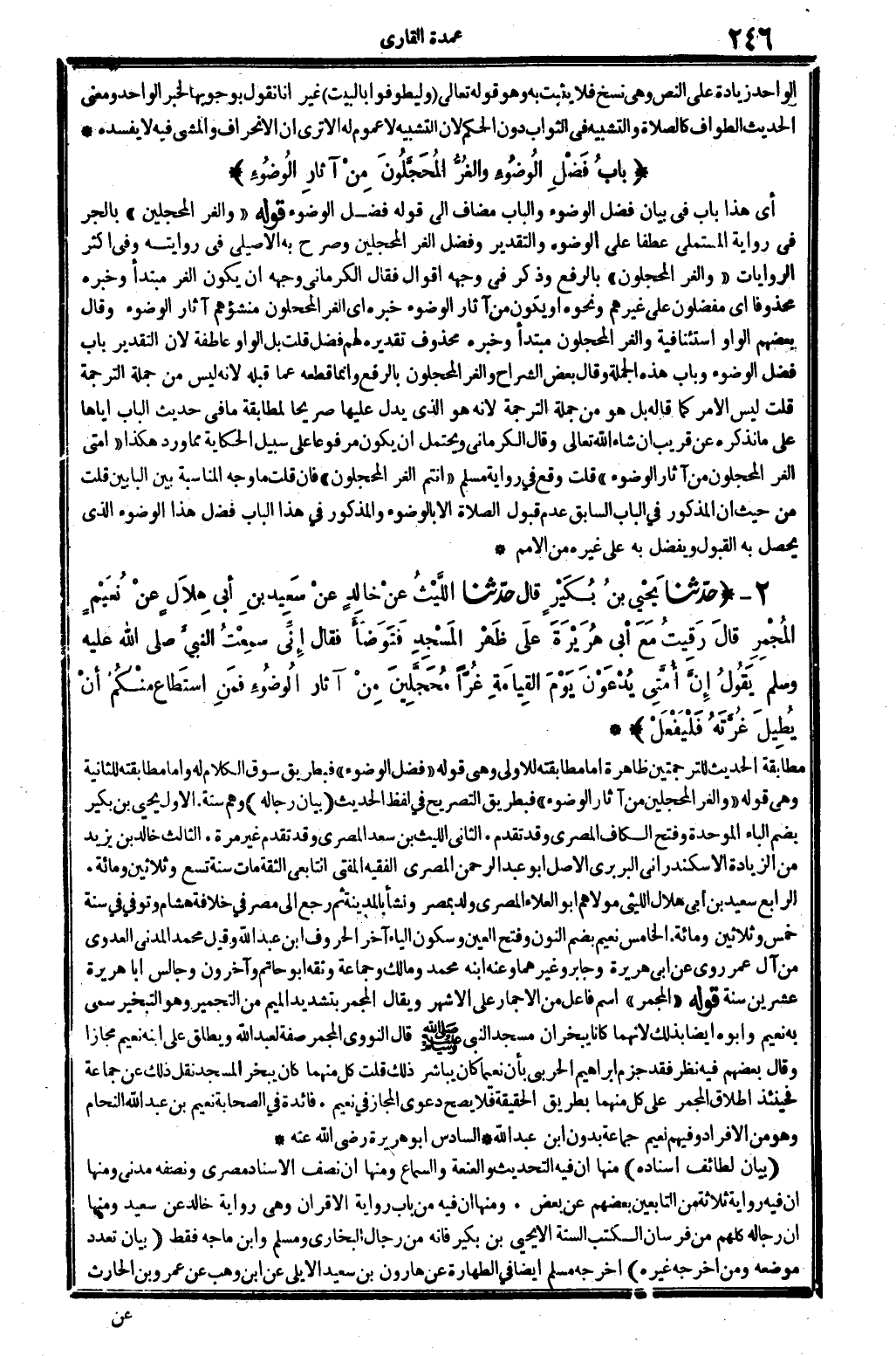 2 - (حَدثنَا يحيى بن بكير قَالَ حَدثنَا اللَّيْث عَن خَالِد عَن سعيد بن أبي هِلَال عَن نعيم المجمر قَالَ رقيت مَعَ أبي هُرَيْرَة على ظهر الْمَسْجِد فَتَوَضَّأ فَقَالَ إِنِّي سَمِعت النَّبِي صلى الله عَلَيْهِ وَسلم يَقُول إِن أمتِي يدعونَ يَوْم الْقِيَامَة غرا محجلين من آثَار الْوضُوء فَمن اسْتَطَاعَ مِنْكُم أَن يُطِيل غرته فَلْيفْعَل) مُطَابقَة الحَدِيث للترجمتين ظَاهِرَة أما مطابقته للأولى وَهِي قَوْله فضل الْوضُوء فبطريق سوق الْكَلَام لَهُ وَأما مطابقته للثَّانِيَة وَهِي قَوْله والغر المحجلين من آثَار الْوضُوء فبطريق التَّصْرِيح فِي لفظ الحَدِيث (بَيَان رِجَاله) وهم سِتَّة الأول يحيى بن بكير بِضَم الْبَاء الْمُوَحدَة وَفتح الْكَاف الْمصْرِيّ وَقد تقدم الثَّانِي اللَّيْث بن سعد الْمصْرِيّ وَقد تقدم غير مرّة الثَّالِث خَالِد بن يزِيد من الزِّيَادَة الإسْكَنْدراني الْبَرْبَرِي الأَصْل أَبُو عبد الرَّحْمَن الْمصْرِيّ الْفَقِيه الْمُفْتِي التَّابِعِيّ الثِّقَة مَاتَ سنة تسع وَثَلَاثِينَ وَمِائَة الرَّابِع سعيد بن أبي هِلَال اللَّيْثِيّ مَوْلَاهُم أَبُو الْعَلَاء الْمصْرِيّ ولد بِمصْر وَنَشَأ بِالْمَدِينَةِ ثمَّ رَجَعَ إِلَى مصر فِي خلَافَة هِشَام وَتُوفِّي فِي سنة خمس وَثَلَاثِينَ وَمِائَة الْخَامِس نعيم بِضَم النُّون وَفتح الْعين وَسُكُون الْيَاء آخر الْحُرُوف ابْن عبد الله وَقيل مُحَمَّد الْمدنِي الْعَدوي من آل عمر روى عَن أبي هُرَيْرَة وَجَابِر وَغَيرهمَا وَعنهُ ابْنه مُحَمَّد وَمَالك وَجَمَاعَة وَثَّقَهُ أَبُو حَاتِم وَآخَرُونَ وجالس أَبَا هُرَيْرَة عشْرين سنة قَوْله المجمر اسْم فَاعل من الإجمار على الْأَشْهر وَيُقَال المجمر بتَشْديد الْمِيم من التجمير وَهُوَ التبخير سمى بِهِ نعيم وَأَبوهُ أَيْضا بذلك لِأَنَّهُمَا كَانَا يبخران مَسْجِد النَّبِي صلى الله عَلَيْهِ وَسلم قَالَ النَّوَوِيّ المجمر صفة لعبد الله وَيُطلق على ابْنه نعيم مجَازًا وَقَالَ بَعضهم فِيهِ نظر فقد جزم إِبْرَاهِيم الْحَرْبِيّ بِأَن نعيما كَانَ يُبَاشر ذَلِك قلت كل مِنْهُمَا كَانَ يبخر الْمَسْجِد نقل ذَلِك عَن جمَاعَة فَحِينَئِذٍ إِطْلَاق المجمر على كل مِنْهُمَا بطرِيق الْحَقِيقَة فَلَا يَصح دَعْوَى الْمجَاز فِي نعيم فَائِدَة فِي الصَّحَابَة نعيم بن عبد الله النحام وَهُوَ من الْأَفْرَاد وَفِيهِمْ نعيم جمَاعَة بِدُونِ ابْن عبد الله السَّادِس أَبُو هُرَيْرَة رَضِي الله عَنهُ (بَيَان لطائف إِسْنَاده) مِنْهَا أَن فِيهِ التحديث والعنعنة وَالسَّمَاع وَمِنْهَا أَن نصف الْإِسْنَاد مصري وَنصفه مدنِي وَمِنْهَا أَن فِيهِ رِوَايَة ثَلَاثَة من التَّابِعين بَعضهم عَن بعض وَمِنْهَا أَن فِيهِ من بَاب رِوَايَة الأقران وَهِي رِوَايَة خَالِد عَن سعيد وَمِنْهَا أَن رِجَاله كلهم من فرسَان الْكتب السِّتَّة إِلَّا يحيى بن بكير فَإِنَّهُ من رجال البُخَارِيّ وَمُسلم وَابْن مَاجَه فَقَط (بَيَان تعدد مَوْضِعه وَمن أخرجه غَيره) أخرجه مُسلم أَيْضا فِي الطَّهَارَة عَن هَارُون بن سعيد الْأَيْلِي عَن ابْن وهب عَن عَمْرو بن الْحَارِث