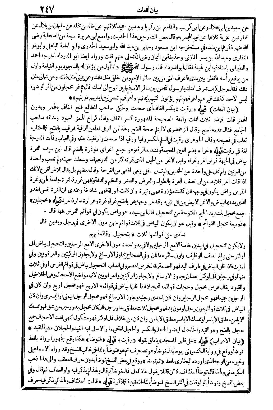 وَلَا يكون التحجيل فِي الْيَدَيْنِ خَاصَّة إِلَّا مَعَ الرجلَيْن وَلَا فِي يَد وَاحِدَة دون الْأُخْرَى إِلَّا مَعَ الرجلَيْن والتحجيل بَيَاض قل أَو كثر حَتَّى يبلغ نصف الوظيف ولون سائره مَا كَانَ وَفِي الصِّحَاح يُجَاوز الأرساغ وَلَا يُجَاوز الرُّكْبَتَيْنِ والعرقوبين وَفِي المغيث فَإِذا كَانَ الْبيَاض فِي طرف الْيَد فَهُوَ الْعِصْمَة يُقَال فرس أعصم وَفِي الْعباب التحجيل بَيَاض فِي قَوَائِم الْفرس أَو فِي ثَلَاث مِنْهَا أَو فِي رجلَيْنِ قل أَو كثر بعد أَن يُجَاوز الأرساغ وَلَا يُجَاوز الرُّكْبَتَيْنِ والعرقوبين لِأَنَّهَا مَوَاضِع الأحجال وَهِي الخلاخيل والقيود يُقَال فرس محجل وحجلت قوائمه تحجيلا فَإِذا كَانَ الْبيَاض فِي قوائمه الْأَرْبَع فَهُوَ محجل أَربع وَإِن كَانَ فِي الرجلَيْن جَمِيعًا فَهُوَ محجل الرجلَيْن وَإِن كَانَ بِإِحْدَى رجلَيْهِ وَجَاوَزَ الأرساغ فَهُوَ محجل الرجل الْيُمْنَى أَو الْيُسْرَى وَإِن كَانَ الْبيَاض فِي ثَلَاث قَوَائِم دون رجل أَو دون يَد فَهُوَ محجل ثَلَاث مُطلق يَد أَو رجل فَإِن كَانَ محجل يَد وَرجل من شقّ فَهُوَ مُمْسك الأيامن مُطلق الأياسر أَو مُمْسك الأياسر مُطلق الأيامن وَإِن كَانَ من خلاف قل أَو كثر فَهُوَ مشكول انْتهى قلت الأحجال جمع حجل بِالْفَتْح وَهُوَ الْقَيْد والخلخال أَيْضا والحجل بِالْكَسْرِ والحجل لُغَة فيهمَا وَالْأَصْل فِيهِ الْقَيْد والحجلان مشْيَة الْمُقَيد (بَيَان الْإِعْرَاب) قَوْله على ظهر الْمَسْجِد يتَعَلَّق بقوله رقيت قَوْله فَتَوَضَّأ هَكَذَا وَقع لجمهور الروَاة بِلَفْظ تَوَضَّأ وَوَقع فِي رِوَايَة الْكشميهني يَوْمًا بدل تَوَضَّأ وَهُوَ تَصْحِيف ثمَّ هُوَ فَتَوَضَّأ بِالْفَاءِ فِي غَالب النّسخ وَقد رَوَاهُ الْإِسْمَاعِيلِيّ وَغَيره من الْوَجْه الَّذِي أوردهُ البُخَارِيّ بِلَفْظ ثمَّ تَوَضَّأ وَوَقع فِي بعض النّسخ تَوَضَّأ بِدُونِ حرف الْعَطف وَإِلَى هَذَا ذهب الْكرْمَانِي وَلِهَذَا قَالَ تَوَضَّأ اسْتِئْنَاف كَأَن قَائِلا يَقُول مَاذَا فعل قَالَ تَوَضَّأ ثمَّ قَالَ وَلِهَذَا لم يذكر فِيهِ وَاو الْعَطف ثمَّ قَالَ وَفِي بعض النّسخ وَتَوَضَّأ بِالْوَاو وَقلت فِي أَكثر النّسخ فَتَوَضَّأ بِالْفَاءِ التعقيبية كَمَا ذكرنَا قَوْله قَالَ اسْتِئْنَاف وَلِهَذَا لم يذكر فِيهِ حرف