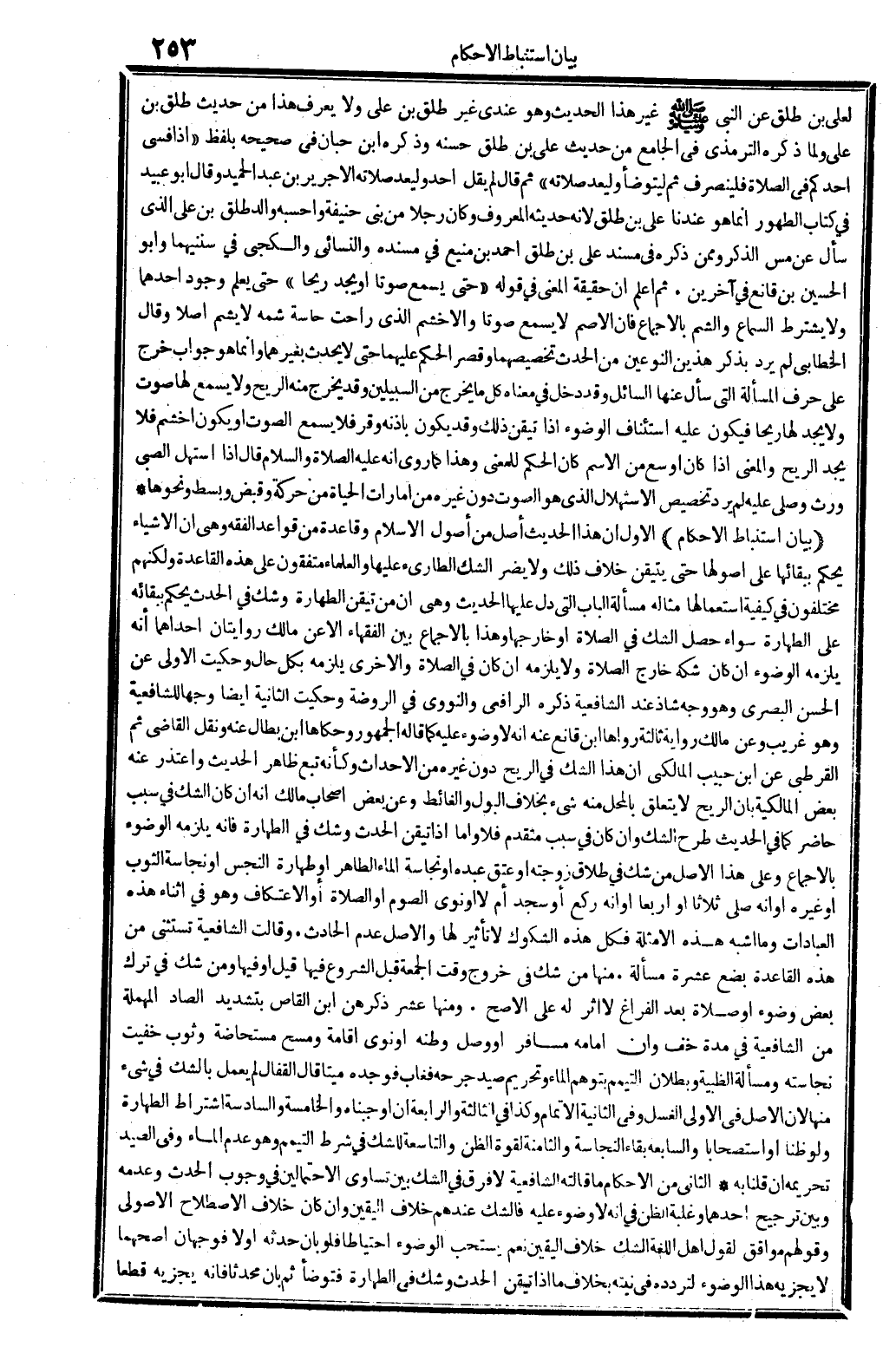 لعَلي بن طلق عَن النَّبِي صلى الله عَلَيْهِ وَسلم غير هَذَا الحَدِيث وَهُوَ عِنْدِي غير طلق بن عَليّ وَلَا يعرف هَذَا من حَدِيث طلق بن عَليّ وَلما ذكره التِّرْمِذِيّ فِي الْجَامِع من حَدِيث عَليّ بن طلق حسنه وَذكره ابْن حبَان فِي صَحِيحه بِلَفْظ إِذا فسى أحدكُم فِي الصَّلَاة فلينصرف ثمَّ ليتوضأ وليعد صلَاته ثمَّ قَالَ لم يقل أحد وليعد صلَاته إِلَّا جرير بن عبد الحميد وَقَالَ أَبُو عبيد فِي كتاب الطّهُور إِنَّمَا هُوَ عندنَا عَليّ بن طلق لِأَنَّهُ حَدِيثه الْمَعْرُوف وَكَانَ رجلا من بني حنيفَة وَأَحْسبهُ وَالِد طلق بن عَليّ الَّذِي سَأَلَ عَن مس الذّكر وَمِمَّنْ ذكره فِي مُسْند عَليّ بن طلق أَحْمد بن منيع فِي مُسْنده وَالنَّسَائِيّ والكجي فِي سنَنَيْهِمَا وَأَبُو الْحُسَيْن بن قَانِع فِي آخَرين. ثمَّ اعْلَم أَن حَقِيقَة الْمَعْنى فِي قَوْله حَتَّى يسمع صَوتا أَو يجد ريحًا حَتَّى يعلم وجود أَحدهمَا وَلَا يشْتَرط السماع والشم بِالْإِجْمَاع فَإِن الْأَصَم لَا يسمع صَوتا والأخشم الَّذِي راحت حاسة شمه لَا يشم أصلا وَقَالَ الْخطابِيّ لم يرد بِذكر هذَيْن النَّوْعَيْنِ من الْحَدث تخصيصهما وَقصر الحكم عَلَيْهِمَا حَتَّى لَا يحدث بِغَيْرِهِمَا وَإِنَّمَا هُوَ جَوَاب خرج على حرف الْمَسْأَلَة الَّتِي سَأَلَ عَنْهَا السَّائِل وَقد دخل فِي مَعْنَاهُ كل مَا يخرج من السَّبِيلَيْنِ وَقد يخرج مِنْهُ الرّيح وَلَا يسمع لَهَا صَوت وَلَا يجد لَهَا ريحًا فَيكون عَلَيْهِ اسْتِئْنَاف الْوضُوء إِذا تَيَقّن ذَلِك وَقد يكون بأذنه وقر فَلَا يسمع الصَّوْت أَو يكون أخشم فَلَا يجد الرّيح وَالْمعْنَى إِذا كَانَ أوسع من الِاسْم كَانَ الحكم للمعنى وَهَذَا كَمَا رُوِيَ أَنه عَلَيْهِ الصَّلَاة وَالسَّلَام قَالَ إِذا اسْتهلّ الصَّبِي ورث وَصلى عَلَيْهِ لم يرد تَخْصِيص الاستهلال الَّذِي هُوَ الصَّوْت دون غَيره من إمارات الْحَيَاة من حَرَكَة وَقبض وَبسط وَنَحْوهَا (بَيَان استنباط الْأَحْكَام) الأول أَن هَذَا الحَدِيث أصل من أصُول الْإِسْلَام وَقَاعِدَة من قَوَاعِد الْفِقْه وَهِي أَن الْأَشْيَاء يحكم ببقائها على أُصُولهَا حَتَّى يتَيَقَّن خلاف ذَلِك وَلَا يضر الشَّك الطارىء عَلَيْهَا وَالْعُلَمَاء متفقون على هَذِه الْقَاعِدَة وَلَكنهُمْ مُخْتَلفُونَ فِي كَيْفيَّة اسْتِعْمَالهَا مِثَاله مَسْأَلَة الْبَاب الَّتِي دلّ عَلَيْهَا الحَدِيث وَهِي أَن من تَيَقّن الطَّهَارَة وَشك فِي الْحَدث يحكم بِبَقَائِهِ على الطَّهَارَة سَوَاء حصل الشَّك فِي الصَّلَاة أَو خَارِجهَا وَهَذَا بالاجماع بَين الْفُقَهَاء إِلَّا عَن مَالك رِوَايَتَانِ إِحْدَاهمَا أَنه يلْزمه الْوضُوء إِن كَانَ شكه خَارج الصَّلَاة وَلَا يلْزمه إِن كَانَ فِي الصَّلَاة وَالْأُخْرَى يلْزمه بِكُل حَال وحكيت الأولى عَن الْحسن الْبَصْرِيّ وَهُوَ وَجه شَاذ عِنْد الشَّافِعِيَّة ذكره الرَّافِعِيّ وَالنَّوَوِيّ فِي الرَّوْضَة وحكيت الثَّانِيَة أَيْضا وَجها للشَّافِعِيَّة وَهُوَ غَرِيب وَعَن مَالك رِوَايَة ثَالِثَة رَوَاهَا ابْن قَانِع عَنهُ أَنه لَا وضوء عَلَيْهِ كَمَا قَالَه الْجُمْهُور وحكاها ابْن بطال عَنهُ وَنقل القَاضِي ثمَّ الْقُرْطُبِيّ عَن ابْن حبيب الْمَالِكِي أَن هَذَا الشَّك فِي الرّيح دون غَيره من الْأَحْدَاث وَكَأَنَّهُ تبع ظَاهر الحَدِيث وَاعْتذر عَنهُ بعض الْمَالِكِيَّة بِأَن الرّيح لَا يتَعَلَّق بِالْمحل مِنْهُ شَيْء بِخِلَاف الْبَوْل وَالْغَائِط وَعَن بعض أَصْحَاب مَالك أَنه إِن كَانَ الشَّك فِي سَبَب حَاضر كَمَا فِي الحَدِيث طرح الشَّك وَإِن كَانَ فِي سَبَب مُتَقَدم فَلَا وَأما إِذا تَيَقّن الْحَدث وَشك فِي الطَّهَارَة فَإِنَّهُ يلْزمه الْوضُوء بِالْإِجْمَاع وعَلى هَذَا الأَصْل من شكّ فِي طَلَاق زَوجته أَو عتق عَبده أَو نَجَاسَة المَاء الطَّاهِر أَو طَهَارَة النَ
