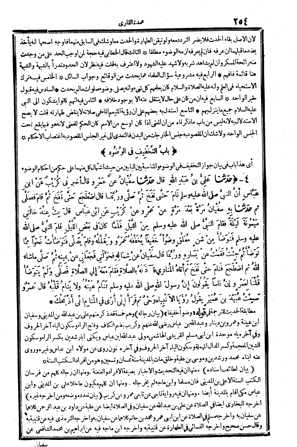 4 - (حَدثنَا عَليّ بن عبد الله قَالَ حَدثنَا سُفْيَان عَن عَمْرو قَالَ أَخْبرنِي كريب عَن ابْن عَبَّاس أَن النَّبِي صلى الله عَلَيْهِ وَسلم نَام حَتَّى نفخ ثمَّ صلى وَرُبمَا قَالَ اضْطجع حَتَّى نفخ ثمَّ قَامَ فصلى ثمَّ حَدثنَا بِهِ سُفْيَان مرّة بعد مرّة عَن عَمْرو عَن كريب عَن ابْن عَبَّاس قَالَ بت عِنْد خَالَتِي مَيْمُونَة لَيْلَة فَقَامَ النَّبِي صلى الله عَلَيْهِ وَسلم من اللَّيْل فَلَمَّا كَانَ فِي بعض اللَّيْل قَامَ النَّبِي صلى الله عَلَيْهِ وَسلم فَتَوَضَّأ من شن مُعَلّق وضوء خَفِيفا يخففه عَمْرو ويقلله وَقَامَ يُصَلِّي فَتَوَضَّأت نَحوا مِمَّا تَوَضَّأ ثمَّ جِئْت فَقُمْت عَن يسَاره وَرُبمَا قَالَ سُفْيَان عَن شِمَاله فحولني فجعلني عَن يَمِينه ثمَّ صلى مَا شَاءَ الله ثمَّ اضْطجع فَنَامَ حَتَّى نفخ ثمَّ أَتَاهُ الْمُنَادِي فآذنه بِالصَّلَاةِ فَقَامَ مَعَه إِلَى الصَّلَاة فصلى وَلم يتَوَضَّأ قُلْنَا لعَمْرو إِن نَاسا يَقُولُونَ إِن رَسُول الله صلى الله عَلَيْهِ وَسلم تنام عينه وَلَا ينَام قلبه قَالَ عَمْرو سَمِعت عبيد بن عُمَيْر يَقُول رُؤْيا الْأَنْبِيَاء وَحي ثمَّ قَرَأَ {إِنِّي أرى فِي الْمَنَام أَنِّي أذبحك} مُطَابقَة الحَدِيث للتَّرْجَمَة فِي قَوْله وضوأ خَفِيفا. (بَيَان رِجَاله) وهم خَمْسَة قد ذكر مِنْهُم عَليّ بن عبد الله بن الْمَدِينِيّ وسُفْيَان بن عُيَيْنَة وَعَمْرو بن دِينَار وَعبد الله بن عَبَّاس رَضِي الله عَنْهُم وكريب بِضَم الْكَاف وَفتح الرَّاء وَسُكُون الْيَاء آخر الْحُرُوف وَفِي آخِره يَاء مُوَحدَة ابْن أبي مُسلم القريشي الْهَاشِمِي مولى عبد الله بن عَبَّاس ويكنى أَبَا رشدين بِكَسْر الرَّاء وَسُكُون الشين الْمُعْجَمَة وَكسر الدَّال الْمُهْملَة وَسُكُون الْيَاء آخر الْحُرُوف وَفِي آخِره نون روى عَن مَوْلَاهُ ابْن عَبَّاس وَغَيره وروى عَنهُ ابناه مُحَمَّد وَرشْدِين ومُوسَى بن عقبَة وَخلق مَاتَ بِالْمَدِينَةِ سنة ثَمَان وَتِسْعين وَهُوَ من أَفْرَاد الْكتب السِّتَّة (بَيَان لطائف إِسْنَاده) مِنْهَا أَن فِيهِ التحديث والإخبار بِصِيغَة الْإِفْرَاد والعنعنة. وَمِنْهَا أَن رِجَاله كلهم من فرسَان الْكتب السِّتَّة إِلَّا عَليّ بن الْمَدِينِيّ فَإِن مُسلما وَابْن مَاجَه لم يخرجَا لَهُ. وَمِنْهَا أَن كلهم مكيون مَا خلا عَليّ بن الْمَدِينِيّ وَابْن عَبَّاس مكي أَقَامَ بِالْمَدِينَةِ أَيْضا. وَمِنْهَا أَن فِيهِ رِوَايَة تَابِعِيّ عَن تَابِعِيّ عَمْرو عَن كريب. (بَيَان تعدد مَوْضِعه وَمن أخرجه غَيره) أخرجه البُخَارِيّ أَيْضا فِي الصَّلَاة عَن عَليّ بن عبد الله عَن سُفْيَان وَفِي الصَّلَاة أَيْضا عَن عقبَة عَن دَاوُد بن عبد الرَّحْمَن كِلَاهُمَا عَن سُفْيَان بِهِ وَأخرجه مُسلم فِي الصَّلَاة عَن ابْن أبي عمر وَمُحَمّد بن حَاتِم كِلَاهُمَا عَن سُفْيَان بِهِ وَأخرجه التِّرْمِذِيّ فِيهِ عَن قُتَيْبَة بِهِ وَقَالَ حسن صَحِيح وَأخرجه النَّسَائِيّ فِي الطَّهَارَة عَن قُتَيْبَة بِهِ وَأخرجه ابْن مَاجَه فِيهِ عَن إِبْرَاهِيم بن مُحَمَّد الشَّافِعِي عَن