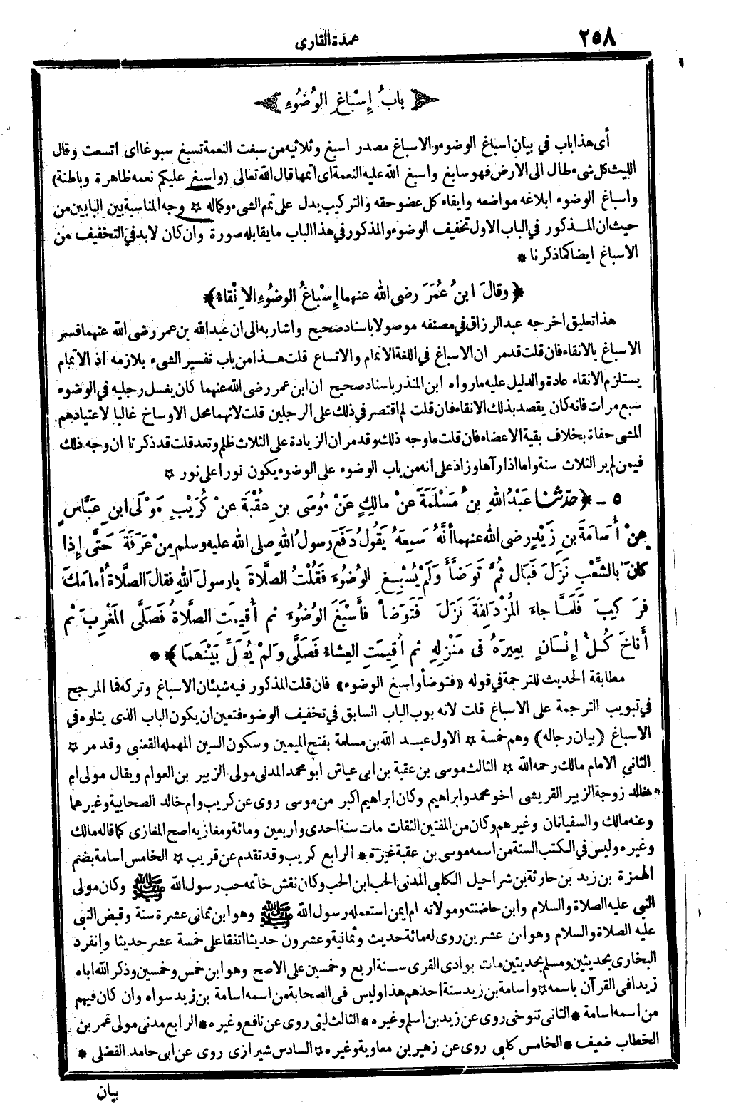 5 - (حَدثنَا عبد الله بن مسلمة عَن مَالك عَن مُوسَى بن عقبَة عَن كريب مولى ابْن عَبَّاس عَن أُسَامَة بن زيد رَضِي الله عَنْهُمَا أَنه سَمعه يَقُول دفع رَسُول الله صلى الله عَلَيْهِ وَسلم من عَرَفَة حَتَّى إِذا كَانَ بِالشعبِ نزل فَبَال ثمَّ تَوَضَّأ وَلم يسبغ الْوضُوء فَقلت الصَّلَاة يَا رَسُول الله فَقَالَ الصَّلَاة أمامك فَركب فَلَمَّا جَاءَ الْمزْدَلِفَة نزل فَتَوَضَّأ فأسبغ الْوضُوء ثمَّ أُقِيمَت الصَّلَاة فصلى الْمغرب ثمَّ أَنَاخَ كل إِنْسَان بعيره فِي منزله ثمَّ أُقِيمَت الْعشَاء فصلى وَلم يصل بَينهمَا) مُطَابقَة الحَدِيث للتَّرْجَمَة فِي قَوْله فَتَوَضَّأ وأسبغ الْوضُوء فَإِن قلت الْمَذْكُور فِيهِ شَيْئَانِ الإسباغ وَتَركه فَمَا الْمُرَجح فِي تبويب التَّرْجَمَة على الإسباغ قلت لِأَنَّهُ بوب الْبَاب السَّابِق فِي تَخْفيف الْوضُوء فَتعين أَن يكون الْبَاب الَّذِي يتلوه فِي الإسباغ. (بَيَان رِجَاله) وهم خَمْسَة الأول عبد الله بن مسلمة بِفَتْح الميمين وَسُكُون السِّين الْمُهْملَة القعْنبِي وَقد مر الثَّانِي الإِمَام مَالك رَحمَه الله الثَّالِث مُوسَى بن عقبَة بن أبي عَيَّاش أَبُو مُحَمَّد الْمدنِي مولى الزبير بن الْعَوام وَيُقَال مولى أم خَالِد زَوْجَة الزبير القريشي أَخُو مُحَمَّد وَإِبْرَاهِيم وَكَانَ إِبْرَاهِيم أكبر من مُوسَى روى عَن كريب وَأم خَالِد الصحابية وَغَيرهمَا وَعنهُ مَالك والسفيانان وَغَيرهم وَكَانَ من الْمُفْتِينَ الثِّقَات مَاتَ سنة إِحْدَى وَأَرْبَعين وَمِائَة ومغازيه أصح الْمَغَازِي كَمَا قَالَه مَالك وَغَيره وَلَيْسَ فِي الْكتب السِّتَّة من اسْمه مُوسَى بن عقبَة غَيره الرَّابِع كريب وَقد تقدم عَن قريب الْخَامِس أُسَامَة بِضَم الْهمزَة بن زيد بن حَارِثَة بن شرَاحِيل الْكَلْبِيّ الْمدنِي الْحبّ ابْن الْحبّ وَكَانَ نقش خَاتمه حب رَسُول الله صلى الله عَلَيْهِ وَسلم وَكَانَ مولى النَّبِي عَلَيْهِ الصَّلَاة وَالسَّلَام وَابْن حاضنته ومولاته أم أَيمن اسْتَعْملهُ رَسُول الله صلى الله عَلَيْهِ وَسلم وَهُوَ ابْن ثَمَانِي عشرَة سنة وَقبض النَّبِي عَلَيْهِ الصَّلَاة وَالسَّلَام وَهُوَ ابْن عشْرين روى لَهُ مائَة حَدِيث وَثَمَانِية وَعِشْرُونَ حَدِيثا اتفقَا على خَمْسَة عشر حَدِيثا وَانْفَرَدَ البُخَارِيّ بحديثين وَمُسلم بحديثين مَاتَ بوادي الْقرى سنة أَربع وَخمسين على الْأَصَح وَهُوَ ابْن خمس وَخمسين وَذكر الله أَبَاهُ زيدا فِي الْقُرْآن باسمه وَأُسَامَة بن زيد سِتَّة أحدهم هَذَا وَلَيْسَ فِي الصَّحَابَة من اسْمه أُسَامَة بن زيد سواهُ وَإِن كَانَ فيهم من اسْمه أُسَامَة الثَّانِي تنوخي روى عَن زيد بن أسلم وَغَيره الثَّالِث ليثي روى عَن نَافِع وَغَيره الرَّابِع مدنِي مولى عمر بن الْخطاب ضَعِيف الْخَامِس كَلْبِي روى عَن زُهَيْر بن مُعَاوِيَة وَغَيره السَّادِس شيرازي روى عَن أبي حَامِد الفضلي