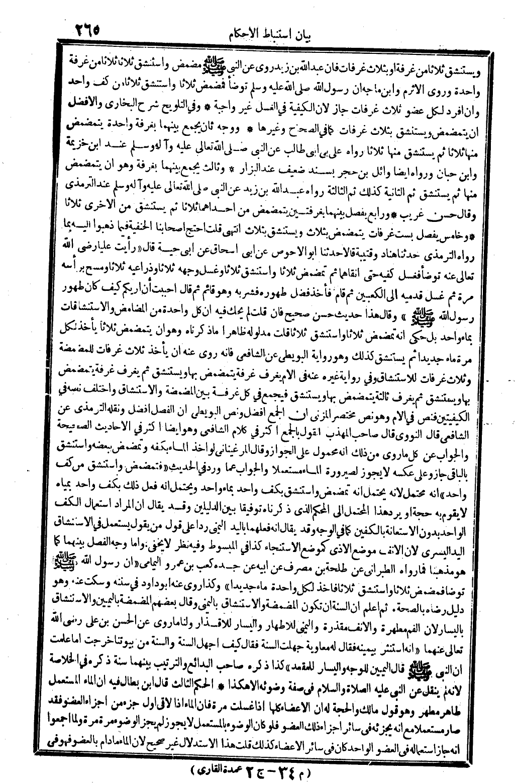 ويستنشق ثَلَاثًا من غرفَة أَو بِثَلَاث غرفات فَإِن عبد الله بن زيد روى عَن النَّبِي صلى الله عَلَيْهِ وَسلم مضمض واستنشق ثَلَاثًا ثَلَاثًا من غرفَة وَاحِدَة وروى الْأَثْرَم وَابْن ماجة أَن رَسُول الله صلى الله عَلَيْهِ وَسلم تَوَضَّأ فَمَضْمض ثَلَاثًا واستنشق ثَلَاثًا من كف وَاحِد وَإِن أفرد لكل عُضْو ثَلَاث غرفات جَازَ لِأَن الْكَيْفِيَّة فِي الْغسْل غير وَاجِبَة وَفِي التَّلْوِيح شرح البُخَارِيّ وَالْأَفْضَل أَن يتمضمض ويستنشق بِثَلَاث غرفات كَمَا فِي الصِّحَاح وَغَيرهَا وَوجه ثَان يجمع بَينهمَا بغرفة وَاحِدَة يتمضمض مِنْهَا ثَلَاثًا ثمَّ يستنشق مِنْهَا ثَلَاثًا رَوَاهُ عَليّ بن أبي طَالب عَن النَّبِي صلى الله تَعَالَى عَلَيْهِ وَآله وَسلم عِنْد ابْن خُزَيْمَة وَابْن حبَان وَرَوَاهُ أَيْضا وَائِل بن حجر بِسَنَد ضَعِيف عِنْد الْبَزَّار وثالث يجمع بَينهمَا بغرفة وَهُوَ أَن يتمضمض مِنْهَا ثمَّ يستنشق ثمَّ الثَّانِيَة كَذَلِك ثمَّ الثَّالِثَة رَوَاهُ عبد الله بن زيد عَن النَّبِي صلى الله تَعَالَى عَلَيْهِ وَآله وَسلم عِنْد التِّرْمِذِيّ وَقَالَ حسن غَرِيب ورابع يفصل بَينهمَا بغرفتين يتمضمض من إِحْدَاهمَا ثَلَاثًا ثمَّ يستنشق من الْأُخْرَى ثَلَاثًا وخامس يفصل بست غرفات يتمضمض بِثَلَاث ويستنشق بِثَلَاث انْتهى قلت احْتج أَصْحَابنَا الْحَنَفِيَّة فِيمَا ذَهَبُوا إِلَيْهِ بِمَا رَوَاهُ التِّرْمِذِيّ حَدثنَا هناد وقتيبة قَالَا حَدثنَا أَبُو الْأَحْوَص عَن أبي إِسْحَاق عَن أبي حَيَّة قَالَ رَأَيْت عليا رَضِي الله تَعَالَى عَنهُ تَوَضَّأ فَغسل كفيه حَتَّى أنقاهما ثمَّ تمضمض ثَلَاثًا واستنشق ثَلَاثًا وَغسل وَجهه ثَلَاثًا وذراعيه ثَلَاثًا وَمسح بِرَأْسِهِ مرّة ثمَّ غسل قَدَمَيْهِ إِلَى الْكَعْبَيْنِ ثمَّ قَامَ فَأخذ فضل طهوره فشربه وَهُوَ قَائِم ثمَّ قَالَ أَحْبَبْت أَن أريكم كَيفَ كَانَ طهُور رَسُول الله صلى الله عَلَيْهِ وَسلم وَقَالَ هَذَا حَدِيث حسن صَحِيح فَإِن قلت لم يحك فِيهِ أَن كل وَاحِدَة من المضامض والاستنشاقات بِمَاء وَاحِد بل حُكيَ أَنه تمضمض ثَلَاثًا واستنشق ثَلَاثًا قلت مَدْلُوله ظَاهرا مَا ذَكرْنَاهُ وَهُوَ أَن يتمضمض ثَلَاثًا يَأْخُذ لكل مرّة مَاء جَدِيدا ثمَّ يستنشق كَذَلِك وَهُوَ رِوَايَة الْبُوَيْطِيّ عَن الشَّافِعِي فَإِنَّهُ روى عَنهُ أَن يَأْخُذ ثَلَاث غرفات للمضمضة وَثَلَاث غرفات للاستنشاق وَفِي رِوَايَة غَيره عَنهُ فِي الْأُم يغْرف غرفَة يتمضمض بهَا ويستنشق ثمَّ يغْرف غرفَة يتمضمض بهَا ويستنشق ثمَّ يغْرف ثَالِثَة يتمضمض بهَا ويستنشق فَيجمع فِي كل غرفَة بَين الْمَضْمَضَة وَالِاسْتِنْشَاق وَاخْتلف نَصه فِي الكيفيتين فنص فِي الْأُم وَهُوَ نَص مُخْتَصر الْمُزنِيّ أَن الْجمع أفضل وَنَصّ الْبُوَيْطِيّ أَن الْفَصْل أفضل وَنَقله التِّرْمِذِيّ عَن الشَّافِعِي قَالَ النَّوَوِيّ قَالَ صَاحب الْمُهَذّب القَوْل بِالْجمعِ أَكثر فِي كَلَام الشَّافِعِي وَهُوَ أَيْضا أَكثر فِي الْأَحَادِيث الصَّحِيحَة وَالْجَوَاب عَن كل مَا روى من ذَلِك أَنه مَحْمُول على الْجَوَاز وَقَالَ المرغيناني لَو أَخذ المَاء بكفه وتمضمض بِبَعْضِه واستنشق بِالْبَاقِي جَازَ وعَلى عَكسه لَا يجوز لصيرورة المَاء مُسْتَعْملا وَالْجَوَاب عَمَّا ورد فِي الحَدِيث فَتَمَضْمَض واستنشق من كف وَاحِد أَنه مُحْتَمل لِأَنَّهُ يحْتَمل أَنه تمضمض واستنشق بكف وَاحِد بِمَاء وَاحِد وَيحْتَمل أَنه فعل ذَلِك بكف وَاحِد بمياه لَا يقوم بِهِ حجَّة أَو يرد هَذَا الْمُحْتَمل إِلَى الْمُحكم الَّذِي ذَكرْنَاهُ تَوْفِيقًا بَين الدَّلِيلَيْنِ وَقد يُقَال أَن المُرَاد اسْتِعْمَال الْكَفّ الْوَاحِد بِدُونِ الِاسْتِعَانَة بالكفين كَمَا فِي الْوَجْه وَقد يُقَال أَنه فعلهمَا بِالْيَدِ الْيُمْنَى ردا على قَول من يَقُول يسْتَعْمل فِي الِاسْتِنْ