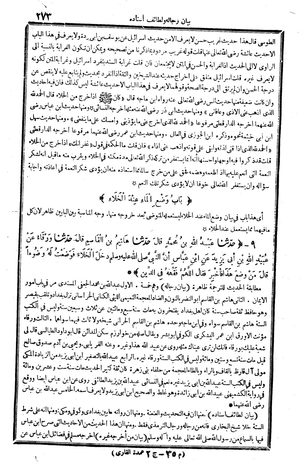 9 - (حَدثنَا عبد الله بن مُحَمَّد قَالَ حَدثنَا هَاشم بن الْقَاسِم قَالَ حَدثنَا وَرْقَاء عَن عبيد الله بن أبي يزِيد عَن ابْن عَبَّاس أَن النَّبِي صلى الله عَلَيْهِ وَسلم دخل الْخَلَاء فَوضعت لَهُ وضُوءًا قَالَ من وضع هَذَا فَأخْبر فَقَالَ اللَّهُمَّ فقهه فِي الدّين) مُطَابقَة الحَدِيث للتَّرْجَمَة ظَاهِرَة. (بَيَان رِجَاله) وهم خَمْسَة. الأول عبد الله بن مُحَمَّد الْجعْفِيّ المسندي مر فِي بَاب أُمُور الْإِيمَان. الثَّانِي هَاشم بن الْقَاسِم أَبُو النَّضر بالنُّون وَالضَّاد الْمُعْجَمَة التَّمِيمِي اللَّيْثِيّ الْكِنَانِي الْخُرَاسَانِي نزل بَغْدَاد وتلقب بقيصر وَهُوَ حَافظ ثِقَة صَاحب سنة كَانَ أهل بَغْدَاد يفتخرون بِهِ مَاتَ سنة سبع وَمِائَتَيْنِ عَن ثَلَاث وَسبعين سنة وَلَيْسَ فِي الْكتب السِّتَّة هَاشم بن الْقَاسِم سواهُ وَفِي ابْن ماجة وَحده هَاشم بن الْقَاسِم الْحَرَّانِي شَيْخه وَلَا ثَالِث فيهمَا سواهُمَا. الثَّالِث وَرْقَاء مؤنث الأورق ابْن عمر الْيَشْكُرِي الْكُوفِي أَبُو بشر وَيُقَال أَصله من خوارزم سكن الْمَدَائِن قَالَ أَبُو دَاوُد الطَّيَالِسِيّ قَالَ لي شُعْبَة عَلَيْك بورقاء فَإنَّك لن ترى عَيْنَاك مثله روى عَن عبيد الله هَذَا وَغَيره وَعنهُ الْفرْيَابِيّ. وَيحيى بن آدم صَدُوق صَالح قيل مَاتَ سنة تسع وَسِتِّينَ وَمِائَة وَلَيْسَ فِي الْكتب السِّتَّة وَرْقَاء غَيره. الرَّابِع عبيد الله بِالتَّصْغِيرِ ابْن أبي يزِيد من الزِّيَادَة الْمَكِّيّ مولى آل قارظ بِالْقَافِ وبالراء وبالظاء الْمُعْجَمَة من حلفاء بني زهرَة كَانَ ثِقَة كثير الحَدِيث مَاتَ سنة سِتّ وَعشْرين وَمِائَة وَلَيْسَ فِي الْكتب السِّتَّة عبيد الله بن أبي يزِيد غَيره نعم فِي النَّسَائِيّ عبيد الله بن يزِيد الطَّائِفِي روى عَن ابْن عَبَّاس أَيْضا وَوَقع فِي رِوَايَة الْكشميهني عبيد الله بن أبي زَائِدَة وَهُوَ غلط وَالصَّحِيح ابْن أبي يزِيد وَلَا يعرف اسْمه. الْخَامِس عبد الله بن عَبَّاس رَضِي الله عَنْهُمَا. (بَيَان لطائف إِسْنَاده) مِنْهَا أَن فِيهِ التحديث والعنعنة. وَمِنْهَا أَن رُوَاته مَا بَين بغدادي وكوفي ومكي: وَمِنْهَا أَنه على شَرط السِّتَّة خلا شيخ البُخَارِيّ فَإِنَّهُ من رِجَاله وَرِجَال التِّرْمِذِيّ فَقَط. وَمِنْهَا أَن هَذَا الحَدِيث من الْأَحَادِيث الَّتِي صرح ابْن عَبَّاس فِيهَا بِالسَّمَاعِ من رَسُول الله صلى الله تَعَالَى عَلَيْهِ وَآله وَسلم. (بَيَان من أخرجه غَيره) أخرجه مُسلم فِي فَضَائِل ابْن عَبَّاس عَن