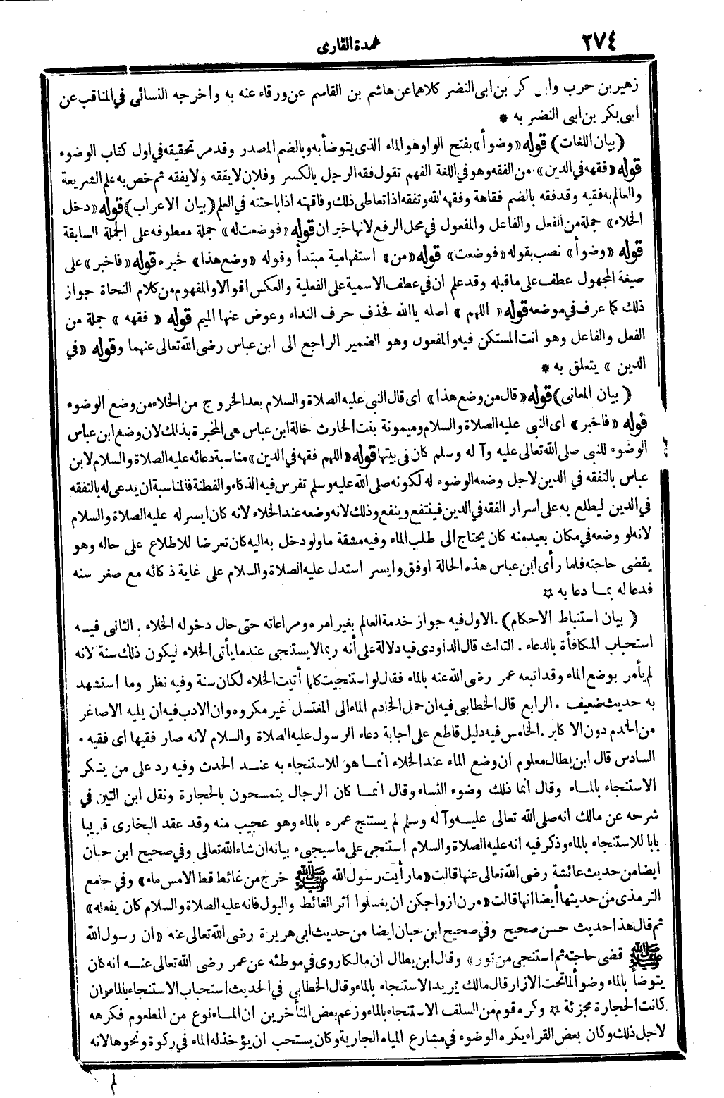 زُهَيْر بن حَرْب وَأبي بكر بن أبي النَّضر كِلَاهُمَا عَن هَاشم بن الْقَاسِم عَن وَرْقَاء عَنهُ بِهِ وَأخرجه النَّسَائِيّ فِي المناقب عَن أبي بكر بن أبي النَّضر بِهِ (بَيَان اللُّغَات) قَوْله وضوأ بِفَتْح الْوَاو وَهُوَ المَاء الَّذِي يتَوَضَّأ بِهِ وبالضم الْمصدر وَقد مر تَحْقِيقه فِي أول كتاب الْوضُوء قَوْله فقهه فِي الدّين من الْفِقْه وَهُوَ فِي اللُّغَة الْفَهم تَقول فقه الرجل بِالْكَسْرِ وَفُلَان لَا يفقه وَلَا يفقه ثمَّ خص بِهِ علم الشَّرِيعَة والعالم بِهِ فَقِيه وَقد فقه بِالضَّمِّ فقاهة وفقهه الله وتفقه إِذا تعاطى ذَلِك وفاقهته إِذا باحثته فِي الْعلم. (بَيَان الْإِعْرَاب) قَوْله دخل الْخَلَاء جملَة من الْفِعْل وَالْفَاعِل وَالْمَفْعُول فِي مَحل الرّفْع لِأَنَّهَا خبر أَن قَوْله فَوضعت لَهُ جملَة معطوفة على الْجُمْلَة السَّابِقَة قَوْله وضوأ نصب بقوله فَوضعت قَوْله من استفهامية مُبْتَدأ وَقَوله وضع هَذَا خَبره قَوْله فَأخْبر على صِيغَة الْمَجْهُول عطف على مَا قبله وَقد علم أَن فِي عطف الاسمية على الفعلية وَالْعَكْس أقوالا وَالْمَفْهُوم من كَلَام النُّحَاة جَوَاز ذَلِك كَمَا عرف فِي مَوْضِعه قَوْله اللَّهُمَّ أَصله يَا الله فَحذف حرف النداء وَعوض عَنْهَا الْمِيم قَوْله فقهه جملَة من الْفِعْل وَالْفَاعِل وَهُوَ أَنْت المستكن فِيهِ وَالْمَفْعُول وَهُوَ الضَّمِير الرَّاجِع إِلَى ابْن عَبَّاس رَضِي الله تَعَالَى عَنْهُمَا وَقَوله فِي الدّين يتَعَلَّق بِهِ. (بَيَان الْمعَانِي) قَوْله قَالَ من وضع هَذَا أَي قَالَ النَّبِي عَلَيْهِ الصَّلَاة وَالسَّلَام بعد الْخُرُوج من الْخَلَاء من وضع الْوضُوء قَوْله فَأخْبر أَي النَّبِي عَلَيْهِ الصَّلَاة وَالسَّلَام ومَيْمُونَة بنت الْحَارِث خَالَة ابْن عَبَّاس هِيَ المخبرة بذلك لِأَن وضع ابْن عَبَّاس الْوضُوء للنَّبِي صلى الله تَعَالَى عَلَيْهِ وَآله وَسلم كَانَ فِي بَيتهَا قَوْله اللَّهُمَّ فقهه فِي الدّين مُنَاسبَة دُعَائِهِ عَلَيْهِ الصَّلَاة وَالسَّلَام لِابْنِ عَبَّاس بالتفقه فِي الدّين لأجل وَضعه الْوضُوء لَهُ لكَونه صلى الله عَلَيْهِ وَسلم تفرس فِيهِ الذكاء والفطنة فالمناسبة أَن يَدعِي لَهُ بالتفقه فِي الدّين ليطلع بِهِ على أسرار الْفِقْه فِي الدّين فينتفع وينفع وَذَلِكَ لِأَنَّهُ وَضعه عِنْد الْخَلَاء لِأَنَّهُ كَانَ أيسر لَهُ عَلَيْهِ الصَّلَاة وَالسَّلَام لِأَنَّهُ لَو وَضعه فِي مَكَان بعيد مِنْهُ كَانَ يحْتَاج إِلَى طلب المَاء وَفِيه مشقة مَا وَلَو دخل بِهِ إِلَيْهِ كَانَ تعرضا للاطلاع على حَاله وَهُوَ يقْضِي حَاجته فَلَمَّا رأى ابْن عَبَّاس هَذِه الْحَالة أوفق وأيسر اسْتدلَّ عَلَيْهِ الصَّلَاة وَالسَّلَام على غَايَة ذكائه مَعَ صغر سنه فَدَعَا لَهُ بِمَا دَعَا بِهِ (بَيَان استنباط الْأَحْكَام) الأول فِيهِ جَوَاز خدمَة الْعَالم بِغَيْر أمره ومراعاته حَتَّى حَال دُخُوله الْخَلَاء. الثَّانِي فِيهِ اسْتِحْبَاب الْمُكَافَأَة بِالدُّعَاءِ. الثَّالِث قَالَ الدَّاودِيّ فِيهِ دلَالَة على أَنه رُبمَا لَا يستنجي عِنْدَمَا يَأْتِي الْخَلَاء ليَكُون ذَلِك سنة لِأَنَّهُ لم يَأْمر بِوَضْع المَاء وَقد اتبعهُ عمر رَضِي الله عَنهُ بِالْمَاءِ فَقَالَ لَو استنجيت كلما أتيت الْخَلَاء لَكَانَ سنة وَفِيه نظر وَمَا اسْتشْهد بِهِ حَدِيث ضَعِيف. الرَّابِع قَالَ الْخطابِيّ فِيهِ أَن حمل الْخَادِم المَاء إِلَى المغتسل غير مَكْرُوه وَأَن الْأَدَب فِيهِ أَن يَلِيهِ الأصاغر من الخدم دون الأكابر. الْخَامِس فِيهِ دَلِيل قَاطع على إِجَابَة دُعَاء الرَّسُول عَلَيْهِ الصَّلَاة وَالسَّلَام لِأَنَّهُ صَار فَقِيها أَي فَقِيه. السَّادِس قَالَ ابْن بطال مَعْلُوم أَن وضع المَاء عِنْد الْخَلَاء إِنَّمَا هُوَ للاستنجاء بِهِ عِنْد الْحَدث وَفِيه رد على من يُنكر الِاسْتِنْجَاء بِالْم