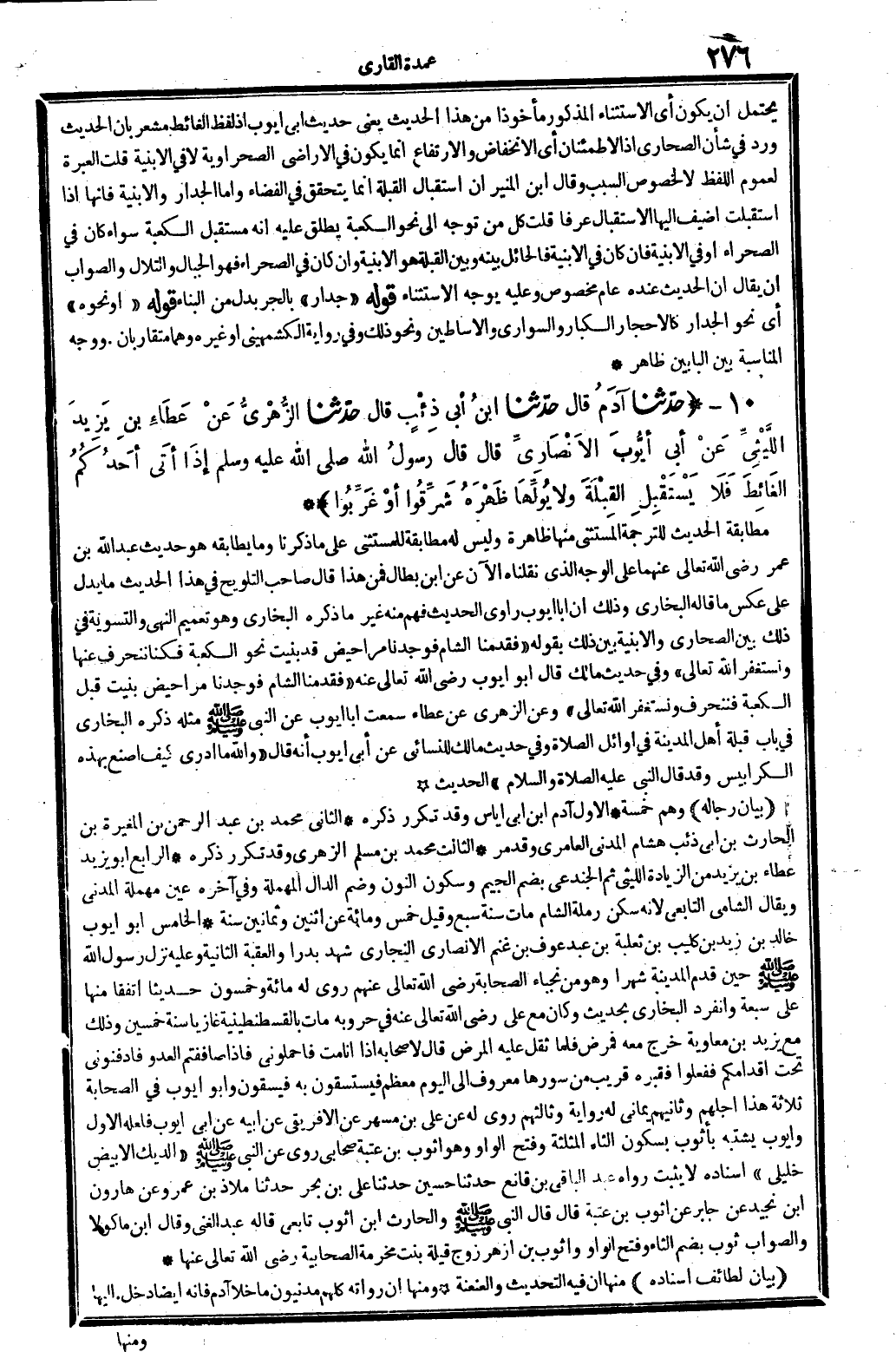 10 - (حَدثنَا آدم قَالَ حَدثنَا ابْن أبي ذِئْب قَالَ حَدثنَا الزُّهْرِيّ عَن عَطاء بن يزِيد اللَّيْثِيّ عَن أبي أَيُّوب الْأنْصَارِيّ قَالَ قَالَ رَسُول الله صلى الله عَلَيْهِ وَسلم إِذا أَتَى أحدكُم الْغَائِط فَلَا يسْتَقْبل الْقبْلَة وَلَا يولها ظَهره شرقوا أَو غربوا) مُطَابقَة الحَدِيث للتَّرْجَمَة الْمُسْتَثْنى مِنْهَا ظَاهِرَة وَلَيْسَ لَهُ مُطَابقَة للمستثنى على مَا ذكرنَا وَمَا يطابقه هُوَ حَدِيث عبد الله بن عمر رَضِي الله تَعَالَى عَنْهُمَا على الْوَجْه الَّذِي نَقَلْنَاهُ الْآن عَن ابْن بطال فَمن هَذَا قَالَ صَاحب التَّلْوِيح فِي هَذَا الحَدِيث مَا يدل على عكس مَا قَالَه البُخَارِيّ وَذَلِكَ أَن أَبَا أَيُّوب رَاوِي الحَدِيث فهم مِنْهُ غير مَا ذكره البُخَارِيّ وَهُوَ تَعْمِيم النَّهْي والتسوية فِي ذَلِك بَين الصَّحَارِي والأبنية بَين ذَلِك بقوله فقدمنا الشَّام فَوَجَدنَا مراحيض قد بنيت نَحْو الْكَعْبَة فَكُنَّا ننحرف عَنْهَا ونستغفر الله تَعَالَى وَفِي حَدِيث مَالك قَالَ أَبُو أَيُّوب رَضِي الله تَعَالَى عَنهُ فقدمنا الشَّام فَوَجَدنَا مراحيض بنيت قبل الْكَعْبَة فننحرف ونستغفر الله تَعَالَى وَعَن الزُّهْرِيّ عَن عَطاء سَمِعت أَبَا أَيُّوب عَن النَّبِي صلى الله عَلَيْهِ وَسلم مثله ذكره البُخَارِيّ فِي بَاب قبْلَة أهل الْمَدِينَة فِي أَوَائِل الصَّلَاة وَفِي حَدِيث مَالك للنسائي عَن أبي أَيُّوب أَنه قَالَ وَالله مَا أَدْرِي كَيفَ أصنع بِهَذِهِ الكرابيس وَقد قَالَ النَّبِي عَلَيْهِ الصَّلَاة وَالسَّلَام الحَدِيث (بَيَان رِجَاله) وهم خَمْسَة الأول آدم ابْن أبي إِيَاس وَقد تكَرر ذكره الثَّانِي مُحَمَّد بن عبد الرَّحْمَن بن الْمُغيرَة بن الْحَارِث بن أبي ذِئْب هِشَام الْمدنِي العامري وَقد مر الثَّالِث مُحَمَّد بن مُسلم الزُّهْرِيّ وَقد تكَرر ذكره الرَّابِع أَبُو يزِيد عَطاء بن يزِيد من الزِّيَادَة اللَّيْثِيّ ثمَّ الجندعي بِضَم الْجِيم وَسُكُون النُّون وَضم الدَّال الْمُهْملَة وَفِي آخِره عين مُهْملَة الْمدنِي وَيُقَال الشَّامي التَّابِعِيّ لِأَنَّهُ سكن رَملَة الشَّام مَاتَ سنة سبع وَقيل خمس وَمِائَة عَن اثْنَيْنِ وَثَمَانِينَ سنة الْخَامِس أَبُو أَيُّوب خَالِد بن زيد بن كُلَيْب بن ثَعْلَبَة بن عبد عَوْف بن غنم الْأنْصَارِيّ النجاري شهد بَدْرًا والعقبة الثَّانِيَة وَعَلِيهِ نزل رَسُول الله صلى الله عَلَيْهِ وَسلم حِين قدم الْمَدِينَة شهرا وَهُوَ من نجباء الصَّحَابَة رَضِي الله تَعَالَى عَنْهُم روى لَهُ مائَة وَخَمْسُونَ حَدِيثا اتفقَا مِنْهَا على سَبْعَة وَانْفَرَدَ البُخَارِيّ بِحَدِيث وَكَانَ مَعَ عَليّ رَضِي الله تَعَالَى عَنهُ فِي حروبه مَاتَ بِالْقُسْطَنْطِينِيَّةِ غازيا سنة خمسين وَذَلِكَ مَعَ يزِيد بن مُعَاوِيَة خرج مَعَه فَمَرض فَلَمَّا ثقل عَلَيْهِ الْمَرَض قَالَ لأَصْحَابه إِذا أَنا مت فاحملوني فَإِذا صافقتم الْعَدو فادفنوني تَحت أقدامكم فَفَعَلُوا فقبره قريب من سورها مَعْرُوف إِلَى الْيَوْم مُعظم فيستسقون بِهِ فيسقون وَأَبُو أَيُّوب فِي الصَّحَابَة ثَلَاثَة هَذَا أَجلهم وثانيهم يماني لَهُ رِوَايَة وثالثهم روى لَهُ عَن عَليّ بن مسْهر عَن الأفريقي عَن أَبِيه عَن أبي أَيُّوب فَلَعَلَّهُ الأول وَأَيوب يشْتَبه بأثوب بِسُكُون الثَّاء الْمُثَلَّثَة وَفتح الْوَاو وَهُوَ أثوب بن عتبَة صَحَابِيّ روى عَن النَّبِي صلى الله عَلَيْهِ وَسلم الديك الْأَبْيَض خليلي إِسْنَاده لَا يثبت رَوَاهُ عبد الْبَاقِي بن قَانِع حَدثنَا حُسَيْن حَدثنَا عَليّ بن بَحر حَدثنَا ملاذ بن عَمْرو عَن هَارُون بن نجيد عَن جَابر عَن أثوب بن عتبَة قَالَ قَالَ النَّبِي صلى الله عَلَيْهِ وَسلم والْحَارث ابْن أثوب تَابِعِيّ قَالَه عبد الْغَنِيّ وَقَالَ ابْن مَاكُولَا وَالصَّوَاب ثوب بِضَم الثَّاء وَفتح الْوَاو وأث