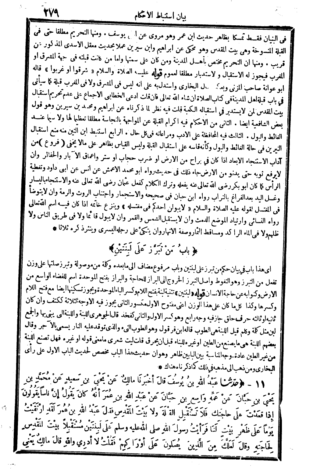 11 - (حَدثنَا عبد الله بن يُوسُف قَالَ أخبرنَا مَالك عَن يحيى بن سعيد عَن مُحَمَّد بن يحيى بن حبَان عَن عَمه وَاسع بن حبَان عَن عبد الله بن عمر أَنه كَانَ يَقُول إِن نَاسا يَقُولُونَ إِذا قعدت على حَاجَتك فَلَا تسْتَقْبل الْقبْلَة وَلَا بَيت الْمُقَدّس فَقَالَ عبد الله بن عمر لقد ارتقيت يَوْمًا على ظهر بَيت لنا فَرَأَيْت رَسُول الله صلى الله عَلَيْهِ وَسلم على لبنتين مُسْتَقْبلا بَيت الْمُقَدّس لِحَاجَتِهِ وَقَالَ لَعَلَّك من الَّذين يصلونَ على أوراكهم فَقلت لَا أَدْرِي وَالله قَالَ مَالك يَعْنِي