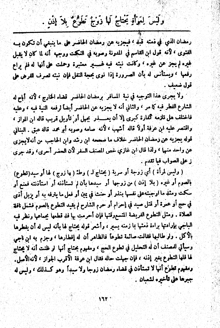(وَلَيْسَ لِمَرْأَةٍ) أَيْ: زَوْجَةٍ أَوْ سُرِّيَّةٍ (يَحْتَاجُ لَ) وَطْءُ (هَا زَوْجٌ) لَهَا أَوْ سَيِّدٌ (تَطَوُّعٌ) بِالصَّوْمِ أَوْ غَيْرِهِ (بِلَا إذْنٍ) مِنْ زَوْجِهَا أَوْ سَيِّدِهَا بِأَنْ لَمْ تَسْتَأْذِنْهُ أَوْ اسْتَأْذَنَتْهُ فَمَنَعَ أَوْ سَكَتَ وَمِثْلُهُ مَا أَوْجَبَتْهُ عَلَى نَفْسِهَا بِنَذْرٍ أَوْ حِنْثٍ فِي يَمِينٍ أَوْ فِعْلِ مَا يَتَرَفَّهُ بِهِ أَوْ يُزِيلُ أَذًى فِي حَجٍّ أَوْ عُمْرَةٍ أَوْ قَتْلِ صَيْدٍ فِي إحْرَامٍ أَوْ حَرَمٍ الشَّارِحُ لَمْ يُقَيِّدْ التَّطَوُّعَ بِالصَّوْمِ فَشَمِلَ نَافِلَةَ الصَّلَاةِ. وَمِثْلُ التَّطَوُّعِ الْفَرِيضَةُ الْمُتَّسَعُ وَقْتُهَا فَإِنْ أَحْرَمَتْ بِهَا فَلَهُ قَطْعُهَا بِجِمَاعِهَا وَنَظَرَ فِيهِ الْبَاجِيَّ بِإِرَادَتِهَا بَرَاءَةَ ذِمَّتِهَا بِمَا زَمَنُهُ يَسِيرٌ، وَأَشْعَرَ قَوْلُهُ يَحْتَاجُ لَهَا بِأَنَّهُ لَيْسَ لَهُ أَنْ يُفْطِرَهَا بِالْأَكْلِ. وَلَوْ طَالَبَهَا فَقَالَتْ صَائِمَةٌ تَطَوُّعًا فَالظَّاهِرُ أَنَّ لَهُ إفْطَارَهَا، وَجَزَمَ بِهِ ابْنُ نَاجِي وَسَيَأْتِي لِلْمُصَنِّفِ أَنَّ لَهُ التَّحْلِيلَ فِي تَطَوُّعِ الْحَجِّ، وَمَفْهُومُ يَحْتَاجُ أَنَّهَا لَوْ ظَنَّتْ أَنَّهُ لَا يَحْتَاجُ لَهَا فَلَهَا التَّطَوُّعُ بِغَيْرِ إذْنِهِ، فَإِنْ جَهِلَتْ فَقَالَ ابْنُ عَرَفَةَ الْأَقْرَبُ الْجَوَازُ،؛ لِأَنَّهُ الْأَصْلُ. وَمَفْهُومُ تَطَوُّعٌ أَنَّهَا لَا تَسْتَأْذِنُ فِي قَضَاءِ رَمَضَانَ زَوْجًا وَلَا سَيِّدًا وَهُوَ كَذَلِكَ، وَلَيْسَ لَهُ جَبْرُهَا عَلَى تَأْخِيرِهِ لِشَعْبَانَ.