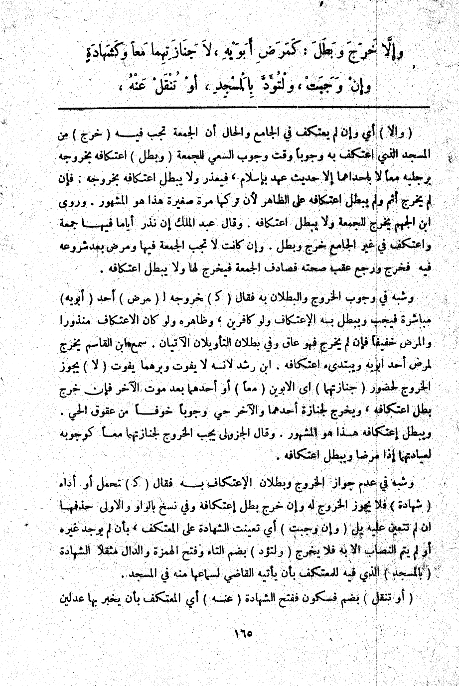 وَشَبَّهَ فِي وُجُوبِ الْخُرُوجِ وَالْبُطْلَانِ بِهِ فَقَالَ (كَ) خُرُوجِهِ لِ (مَرَضِ) أَحَدِ (أَبَوَيْهِ) مُبَاشَرَةً فَيَجِبُ وَيَبْطُلُ بِهِ الِاعْتِكَافُ وَلَوْ كَافِرَيْنِ، وَظَاهِرُهُ وَلَوْ كَانَ الِاعْتِكَافُ مَنْذُورًا وَالْمَرَضُ خَفِيفًا فَإِنْ لَمْ يَخْرُجْ فَهُوَ عَاقٌّ وَفِي بُطْلَانٍ التَّأْوِيلَانِ الْآتِيَانِ. سَمِعَ ابْنُ الْقَاسِمِ يَخْرُجُ لِمَرَضِ أَحَدِ أَبَوَيْهِ وَيَبْتَدِئُ اعْتِكَافَهُ. ابْنُ رُشْدٍ؛ لِأَنَّهُ لَا يَفُوتُ وَبِرُّهُمَا يَفُوتُ (لَا) يَجُوزُ الْخُرُوجُ لِحُضُورِ (جِنَازَتِهِمَا) أَيْ الْأَبَوَيْنِ (مَعًا) أَوْ أَحَدِهِمَا بَعْدَ مَوْتِ الْآخَرِ فَإِنْ خَرَجَ بَطَلَ اعْتِكَافُهُ، وَيَخْرُجُ لِجِنَازَةِ أَحَدِهِمَا وَالْآخَرُ حَيٌّ وُجُوبًا خَوْفًا مِنْ عُقُوقِ الْحَيِّ. وَيَبْطُلُ اعْتِكَافُهُ هَذَا هُوَ الْمَشْهُورُ. وَقَالَ الْجُزُولِيُّ: يَجِبُ الْخُرُوجُ لِجِنَازَتِهِمَا مَعًا كَوُجُوبِهِ لِعِيَادَتِهِمَا إذَا مَرِضَا وَيَبْطُلُ اعْتِكَافُهُ.