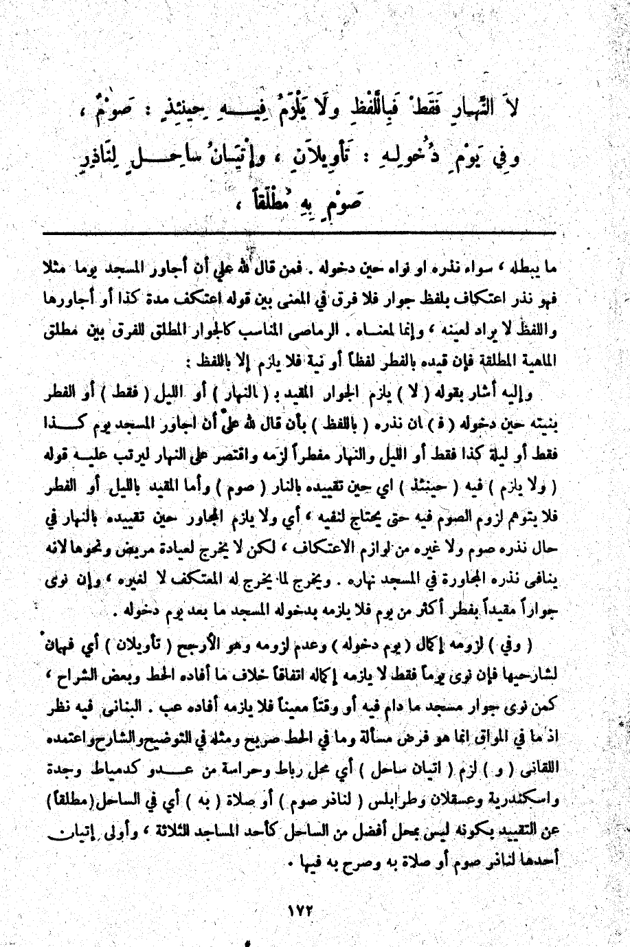 ـــــــــــــــــــــــــــــQمَا يُبْطِلُهُ، سَوَاءٌ نَذَرَهُ أَوْ نَوَاهُ حِينَ دُخُولِهِ. فَمَنْ قَالَ لِلَّهِ عَلَيَّ أَنْ أُجَاوِرَ الْمَسْجِدَ يَوْمًا مَثَلًا فَهُوَ نَذْرُ اعْتِكَافٍ بِلَفْظِ جِوَارٍ فَلَا فَرْقَ فِي الْمَعْنَى بَيْنَ قَوْلِهِ أَعْتَكِفُ مُدَّةَ كَذَا أَوْ أُجَاوِرُهَا وَاللَّفْظُ لَا يُرَادُ لِعَيْنِهِ، وَإِنَّمَا لِمَعْنَاهُ. الرَّمَاصِيُّ الْمُنَاسِبُ كَالْجِوَارِ الْمُطْلَقِ لِلْفَرْقِ بَيْنَ مُطْلَقِ الْمَاهِيَّةِ الْمُطْلَقَةِ فَإِنْ قَيَّدَهُ بِالْفِطْرِ لَفْظًا أَوْ نِيَّةً فَلَا يَلْزَمُ إلَّا بِاللَّفْظِ: