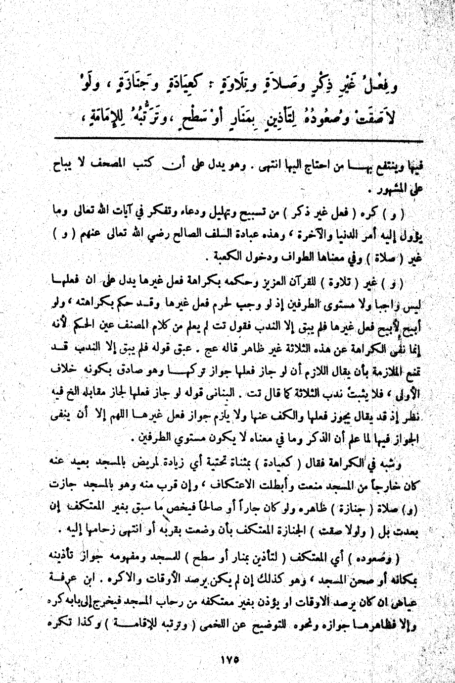 وَفِعْلُ غَيْرِ ذِكْرٍ وَصَلَاةٍ وَتِلَاوَةٍ: كَعِيَادَةٍ وَجِنَازَةٍ، وَلَوْ لَاصَقَتْ وَصُعُودُهُ لِتَأْذِينٍ بِمَنَارٍ أَوْ سَطْحٍ، وَتَرَتُّبُهُ لِلْإِمَامَةِ
