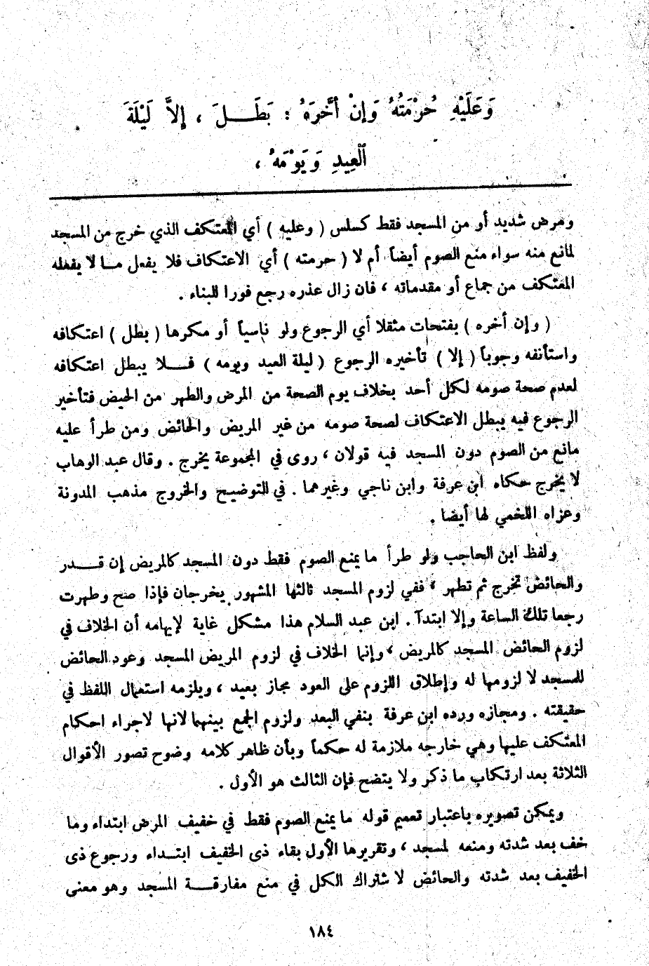 وَلَفْظُ ابْنِ الْحَاجِبِ وَلَوْ طَرَأَ مَا يَمْنَعُ الصَّوْمَ فَقَطْ دُونَ الْمَسْجِدِ كَالْمَرِيضِ إنْ قَدَرَ وَالْحَائِضُ تَخْرُجُ ثُمَّ تَطْهُرُ، فَفِي لُزُومِ الْمَسْجِدِ ثَالِثُهَا الْمَشْهُورُ يَخْرُجَانِ فَإِذَا صَحَّ وَطَهُرَتْ رَجَعَا تِلْكَ السَّاعَةَ وَإِلَّا ابْتِدَاءً. ابْنُ عَبْدِ السَّلَامِ هَذَا مُشْكِلُ غَايَةٍ لِإِيهَامِهِ أَنَّ الْخِلَافَ فِي لُزُومِ الْحَائِضِ الْمَسْجِدَ كَالْمَرِيضِ، وَإِنَّمَا الْخِلَافُ فِي لُزُومِ الْمَرِيضِ الْمَسْجِدَ وَعَوْدِ الْحَائِضِ لِلْمَسْجِدِ لَا لُزُومِهَا لَهُ وَإِطْلَاقُ اللُّزُومِ عَلَى الْعَوْدِ مَجَازٌ بَعِيدٌ، وَيَلْزَمُهُ اسْتِعْمَالُ اللَّفْظِ فِي حَقِيقَتِهِ. وَمَجَازُهُ وَرَدَّهُ ابْنُ عَرَفَةَ بِنَفْيِ الْبُعْدِ وَلُزُومِ الْجَمْعِ بَيْنَهُمَا؛ لِأَنَّهَا لِإِجْرَاءِ أَحْكَامِ الْمُعْتَكِفِ عَلَيْهَا وَهِيَ خَارِجَةٌ مُلَازِمَةٌ لَهُ حُكْمًا وَبِأَنَّ ظَاهِرَ كَلَامِهِ وُضُوحُ تَصَوُّرِ الْأَقْوَالِ الثَّلَاثَةِ بَعْدَ ارْتِكَابِ مَا ذُكِرَ وَلَا يَتَّضِحُ فَإِنَّ الثَّالِثَ هُوَ الْأَوَّلُ.