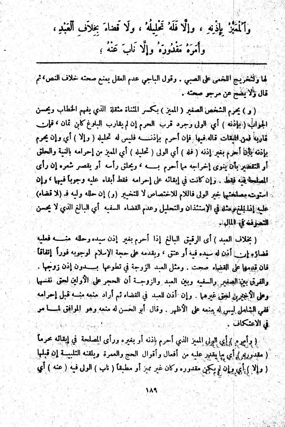 (وَ) يُحْرِمُ الشَّخْصُ الصَّغِيرُ (الْمُمَيِّزُ) بِكَسْرِ الْمُثَنَّاةِ مُثَقَّلَةً الَّذِي يَفْهَمُ الْخِطَابَ وَيُحْسِنُ الْجَوَابَ (بِإِذْنِهِ) أَيْ الْوَلِيِّ وَجُرِّدَ قُرْبَ الْحَرَمِ إنْ لَمْ يُقَارِبْ الْبُلُوغَ كَابْنِ ثَمَانٍ، فَإِنْ قَارَبَهُ فَمِنْ الْمِيقَاتِ قَالَهُ فِيهَا فَإِنْ أَحْرَمَ بِإِذْنِهِ فَلَيْسَ لَهُ تَحْلِيلُهُ (وَإِلَّا) أَيْ: وَإِنْ يُحْرِمْ بِإِذْنِهِ بِأَنْ أَحْرَمَ بِغَيْرِ إذْنِهِ (فَلَهُ) أَيْ الْوَلِيِّ (تَحْلِيلُهُ) أَيْ: الْمُمَيِّزِ مِنْ إحْرَامِهِ بِالنِّيَّةِ وَالْحَلْقِ أَوْ التَّقْصِيرِ بِأَنْ يَنْوِيَ إخْرَاجَهُ مِمَّا أَحْرَمَ بِهِ، وَيَحْلِقَ رَأْسَهُ أَوْ يُقَصِّرَ شَعْرَهُ إنْ رَأَى الْمَصْلَحَةَ فِيهِ فَقَطْ. وَإِنْ كَانَتْ فِي إبْقَائِهِ عَلَى إحْرَامِهِ فَقَطْ أَبْقَاهُ عَلَيْهِ وُجُوبًا فِيهِمَا، وَإِنْ اسْتَوَتْ مَصْلَحَتُهُمَا خُيِّرَ الْوَلِيُّ فَاللَّامُ لِلِاخْتِصَاصِ لَا لِلتَّخْيِيرِ (وَ) إنْ حَلَّلَهُ وَلِيُّهُ فَ (لَا قَضَاءَ) عَلَيْهِ إذَا بَلَغَ وَمِثْلُهُ فِي الِاسْتِئْذَانِ وَالتَّحْلِيلِ وَعَدَمِ الْقَضَاءِ السَّفِيهُ أَيْ: الْبَالِغُ الَّذِي لَا يُحْسِنُ التَّصَرُّفَ فِي الْمَالِ.