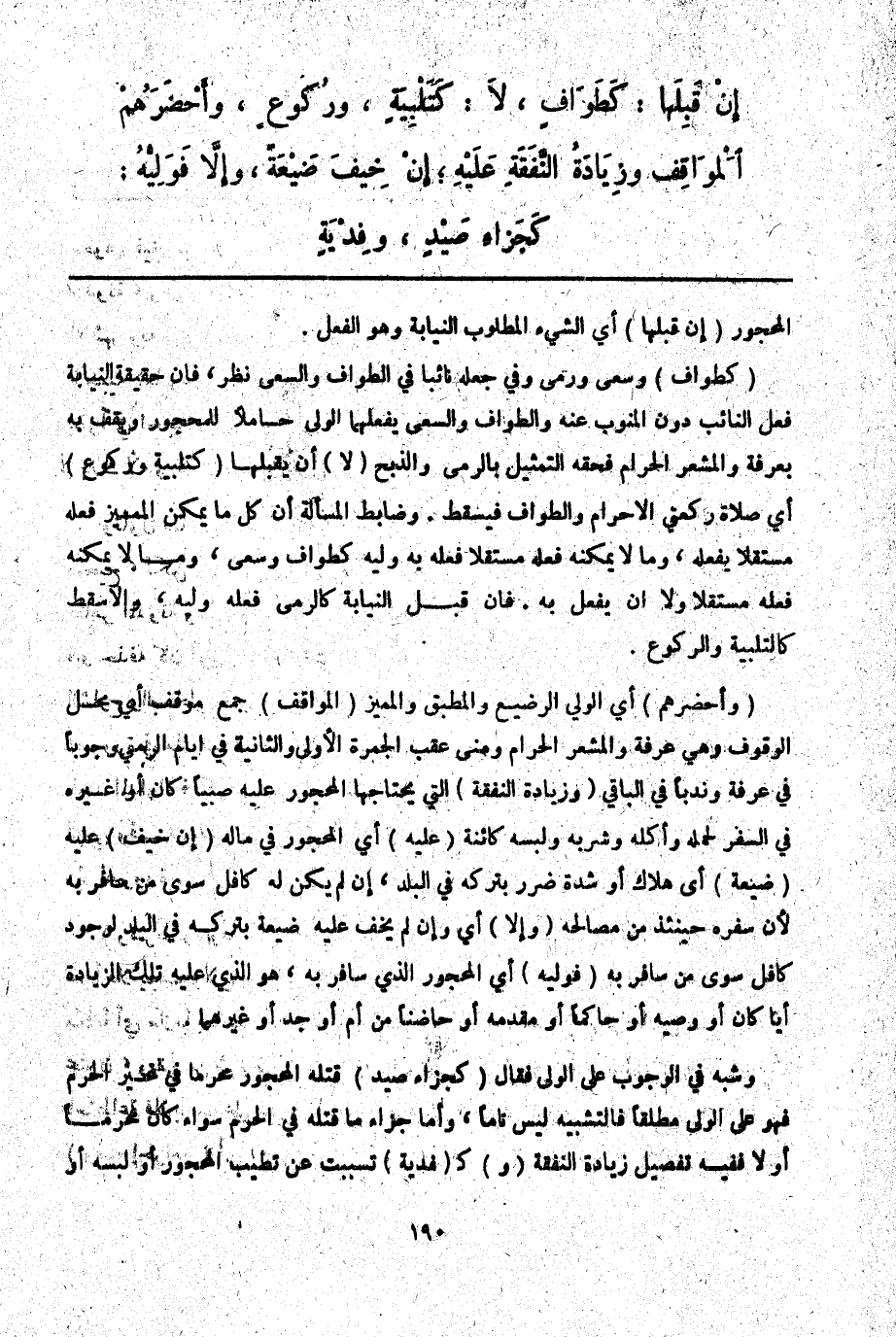 وَشَبَّهَ فِي الْوُجُوبِ عَلَى الْوَلِيِّ فَقَالَ (كَجَزَاءِ صَيْدٍ) قَتَلَهُ الْمَحْجُورُ مُحْرِمًا فِي غَيْرِ الْحَرَمِ فَهُوَ عَلَى الْوَلِيِّ مُطْلَقًا فَالتَّشْبِيهُ لَيْسَ تَامًّا، وَأَمَّا جَزَاءُ مَا قَتَلَهُ فِي الْحَرَمِ سَوَاءٌ كَانَ مُحْرِمًا أَوْ لَا فَفِيهِ تَفْصِيلُ زِيَادَةِ النَّفَقَةِ (وَ) كَ (فِدْيَةٍ) تَسَبَّبَتْ عَنْ تَطَيُّبِ الْمَحْجُورِ أَوْ لُبْسِهِ أَوْ