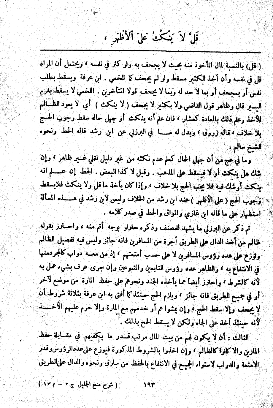 ـــــــــــــــــــــــــــــQقَلَّ) بِالنِّسْبَةِ لِمَالِ الْمَأْخُوذِ مِنْهُ بِحَيْثُ لَا يُجْحِفُ بِهِ وَلَوْ كَثُرَ فِي نَفْسِهِ، وَيُحْتَمَلُ أَنَّ الْمُرَادَ قَلَّ فِي نَفْسِهِ وَأَنَّ أَخْذَ الْكَثِيرِ مُسْقِطٌ وَلَوْ لَمْ يُجْحِفْ كَمَا لِلَّخْمِيِّ. ابْنِ عَرَفَةَ وَيَسْقُطُ بِطَلَبِ نَفْسٍ أَوْ بِمُجْحِفٍ أَوْ بِمَا لَا حَدَّ لَهُ وَبِمَا لَا يُجْحِفُ قَوْلَا الْمُتَأَخِّرِينَ. اللَّخْمِيُّ لَا يَسْقُطُ بِغُرْمِ الْيَسِيرِ قَالَ وَظَاهِرُ قَوْلِ الْقَاضِي وَلَا بِكَثِيرٍ لَا يُجْحِفُ (لَا يَنْكُثُ) أَيْ لَا يَعُودُ الظَّالِمُ لِلْأَخْذِ وَعَلِمَ ذَلِكَ بِالْعَادَةِ كَعِشَارٍ، فَإِنْ عَلِمَ أَنَّهُ يَنْكُثُ أَوْ جَهِلَ سَقَطَ وُجُوبُ الْحَجِّ. بِلَا خِلَافٍ، قَالَهُ زَرُّوقٌ، وَيَدُلُّ لَهُ مَا فِي الْبُرْزُلِيُّ عَنْ ابْنِ رُشْدٍ قَالَهُ الْحَطّ وَنَحْوِهِ لِلشَّيْخِ سَالِمٍ.