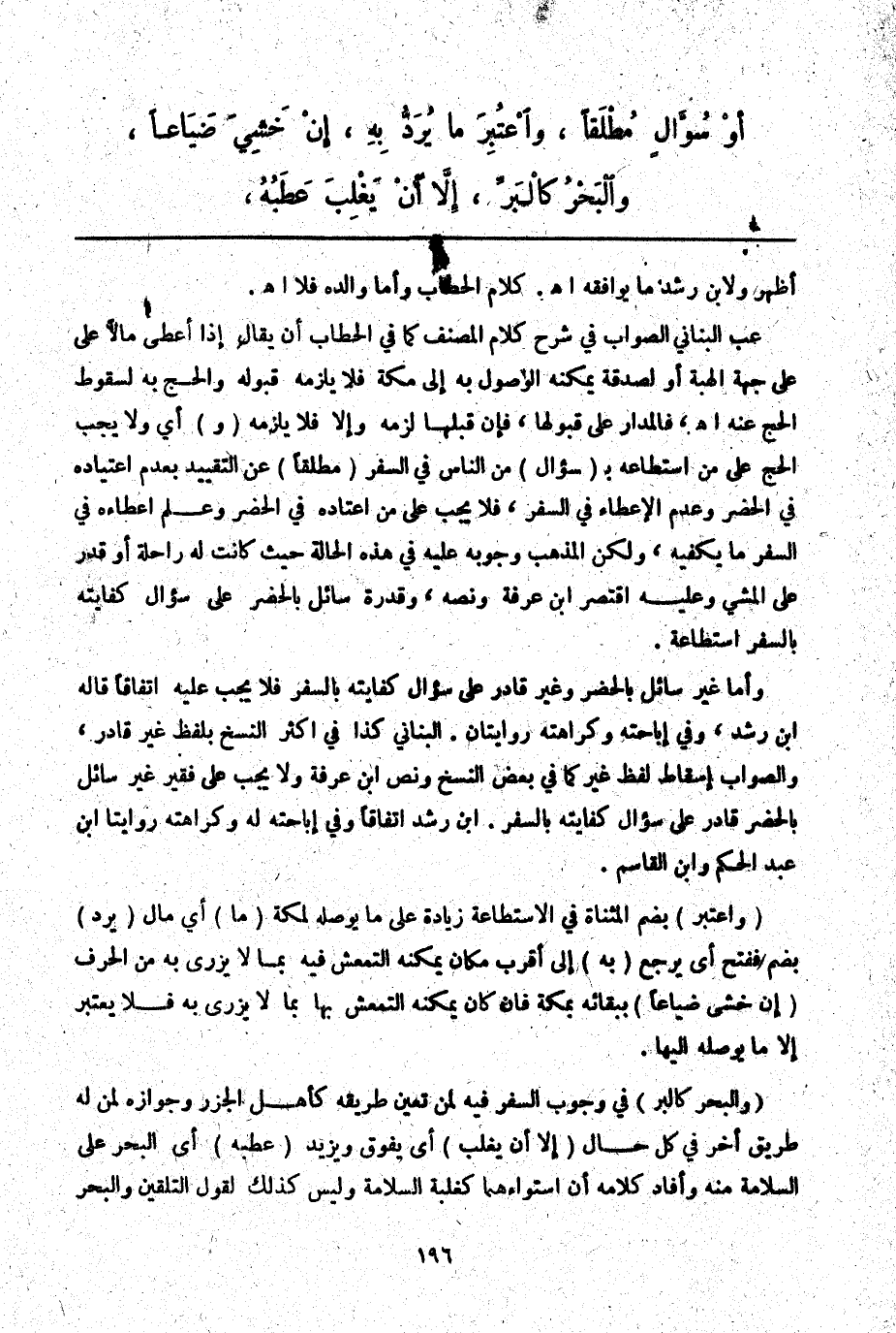 عب الْبُنَانِيُّ الصَّوَابُ فِي شَرْحِ كَلَامِ الْمُصَنِّفِ كَمَا فِي الْحَطَّابِ أَنْ يُقَالَ إذَا أَعْطَى مَالًا عَلَى جِهَةِ الْهِبَةِ أَوْ لِصَدَقَةٍ يُمْكِنُهُ الْوُصُولُ بِهِ إلَى مَكَّةَ فَلَا يَلْزَمُهُ قَبُولُهُ وَالْحَجُّ بِهِ لِسُقُوطِ الْحَجِّ عَنْهُ اهـ، فَالْمَدَارُ عَلَى قَبُولِهَا، فَإِنْ قَبِلَهَا لَزِمَهُ وَإِلَّا فَلَا يَلْزَمُهُ (وَ) أَيْ: وَلَا يَجِبُ الْحَجُّ عَلَى مَنْ اسْتَطَاعَهُ بِ (سُؤَالٍ) مِنْ النَّاسِ فِي السَّفَرِ (مُطْلَقًا) عَنْ التَّقْيِيدِ بِعَدَمِ اعْتِيَادِهِ فِي الْحَضَرِ وَعَدَمِ الْإِعْطَاءِ فِي السَّفَرِ، فَلَا يَجِبُ عَلَى مَنْ اعْتَادَهُ فِي الْحَضَرِ وَعَلِمَ إعْطَاءَهُ فِي السَّفَرِ مَا يَكْفِيهِ، وَلَكِنَّ الْمَذْهَب وُجُوبُهُ عَلَيْهِ فِي هَذِهِ الْحَالَةِ حَيْثُ كَانَتْ لَهُ رَاحِلَةٌ أَوْ قَدَرَ عَلَى الْمَشْيِ وَعَلَيْهِ اقْتَصَرَ ابْنُ عَرَفَةَ وَنَصَّهُ، وَقُدْرَةُ سَائِلٍ بِالْحَضَرِ عَلَى سُؤَالٍ كِفَايَتُهُ بِالسَّفَرِ اسْتِطَاعَةً.