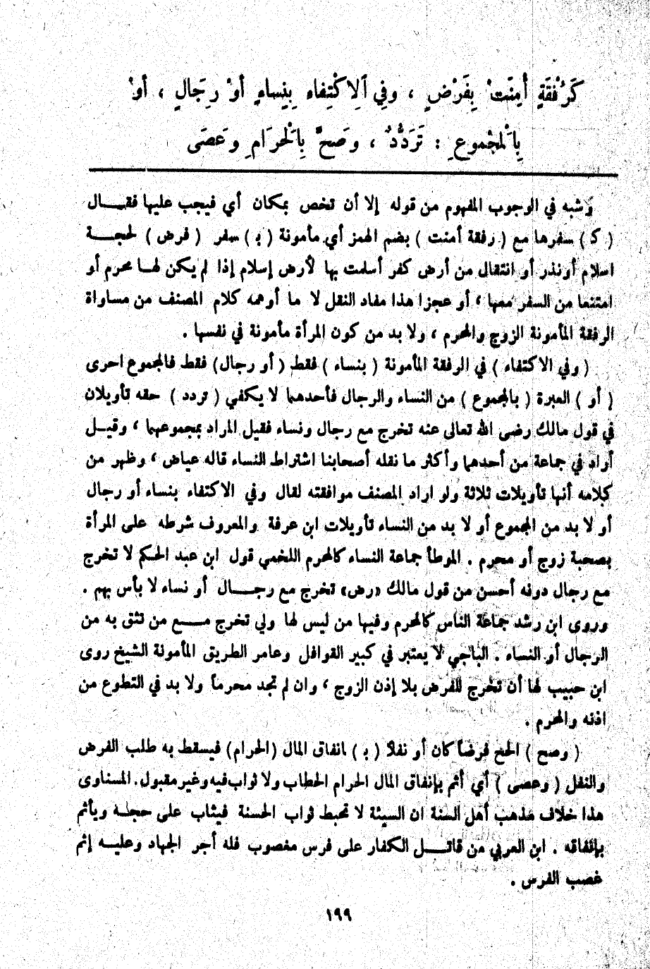 (وَفِي الِاكْتِفَاءِ) فِي الرُّفْقَةِ الْمَأْمُونَةِ (بِنِسَاءٍ) فَقَطْ (أَوْ رِجَالٍ) فَقَطْ فَالْمَجْمُوعُ أَحْرَى (أَوْ) الْعِبْرَةُ (بِالْمَجْمُوعِ) مِنْ النِّسَاءِ وَالرِّجَالِ فَأَحَدُهُمَا لَا يَكْفِي (تَرَدُّدٌ) حَقُّهُ تَأْوِيلَانِ فِي قَوْلِ مَالِكٍ - رَضِيَ اللَّهُ تَعَالَى عَنْهُ - تَخْرُجُ مَعَ رِجَالٍ وَنِسَاءٍ قِيلَ الْمُرَادُ بِمَجْمُوعِهِمَا، وَقِيلَ أَرَادَ فِي جَمَاعَةٍ مِنْ أَحَدِهِمَا وَأَكْثَرُ مَا نَقَلَهُ أَصْحَابُنَا اشْتِرَاطُ النِّسَاءِ قَالَهُ عِيَاضٌ، وَظَهَرَ مِنْ كَلَامِهِ أَنَّهَا تَأْوِيلَاتٌ ثَلَاثَةٌ وَلَوْ أَرَادَ الْمُصَنِّفُ مُوَافَقَتَهُ لَقَالَ وَفِي الِاكْتِفَاءِ بِنِسَاءٍ أَوْ رِجَالٍ أَوْ لَا بُدَّ مِنْ الْمَجْمُوعِ أَوْ لَا بُدَّ مِنْ النِّسَاءِ تَأْوِيلَاتُ ابْنِ عَرَفَةَ وَالْمَعْرُوفُ شَرْطُهُ عَلَى الْمَرْأَةِ بِصُحْبَةِ زَوْجٍ أَوْ مَحْرَمٍ. الْمُوَطَّإِ جَمَاعَةُ النِّسَاءِ كَالْمَحْرَمِ اللَّخْمِيِّ قَوْلُ ابْنِ عَبْدِ الْحَكَمِ لَا تَخْرُجُ مَعَ رِجَالٍ دُونَهُ أَحْسَنُ مِنْ قَوْلِ مَالِكٍ - رَضِيَ اللَّهُ عَنْهُ - تَخْرُجُ مَعَ رِجَالٍ أَوْ نِسَاءٍ لَا بَأْسَ بِهِمْ.
