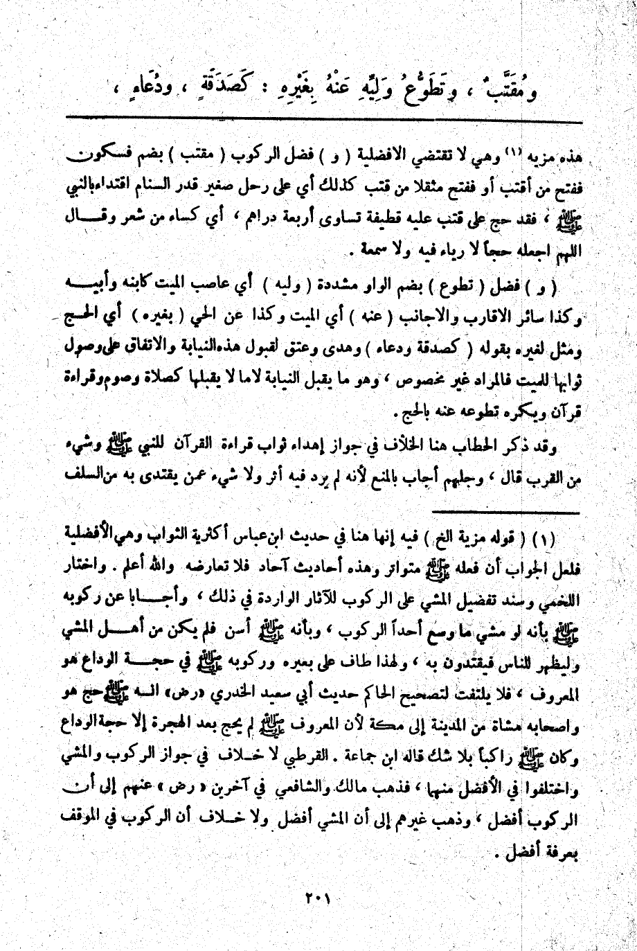 ـــــــــــــــــــــــــــــQهَذِهِ مَزِيَّةٌ وَهِيَ لَا تَقْتَضِي الْأَفْضَلِيَّةَ (وَ) فَضْلُ الرُّكُوبِ (مُقَتَّبٌ) بِضَمٍّ فَسُكُونٍ فَفَتْحٍ مِنْ أَقَتَبَ أَوْ فَفَتْحٍ مُثَقَّلًا مِنْ قَتَبَ كَذَلِكَ أَيْ عَلَى رَحْلٍ صَغِيرٍ قَدْرَ السَّنَامِ اقْتِدَاءً بِالنَّبِيِّ - صَلَّى اللَّهُ عَلَيْهِ وَسَلَّمَ - «فَقَدْ حَجَّ عَلَى قَتَبٍ عَلَيْهِ قَطِيفَةٌ تُسَاوِي أَرْبَعَةَ دَرَاهِمَ، أَيْ: كِسَاءٌ مِنْ شَعْرٍ وَقَالَ اللَّهُمَّ اجْعَلْهُ حَجًّا لَا رِيَاءَ فِيهِ وَلَا سُمْعَةَ» .