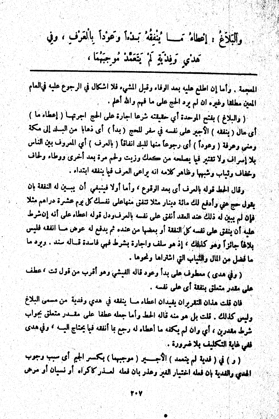 فَإِنْ قُلْت هَذَانِ التَّقْرِيرَانِ يُفِيدَانِ إعْطَاءَ مَا يُنْفِقُهُ فِي هَدْيٍ وَفِدْيَةٍ مِنْ مُسَمَّى الْبَلَاغِ وَلَيْسَ كَذَلِكَ. قُلْت بَلْ هُوَ مِنْهُ قَالَهُ الْحَطّ وَأَمَّا جَعْلُهُ عَطْفًا عَلَى مُقَدَّرٍ مُتَعَلِّقٍ بِجَوَابِ شَرْطٍ مُقَدَّرَيْنِ، أَيْ: وَإِنْ لَمْ يَكْفِهِ مَا أَعْطَاهُ لَهُ رَجَعَ بِمَا أَنْفَقَهُ فِيمَا يَحْتَاجُ إلَيْهِ، وَفِي هَدْيٍ فَفِي غَايَةِ التَّكْلِيفِ بِلَا ضَرُورَةٍ.