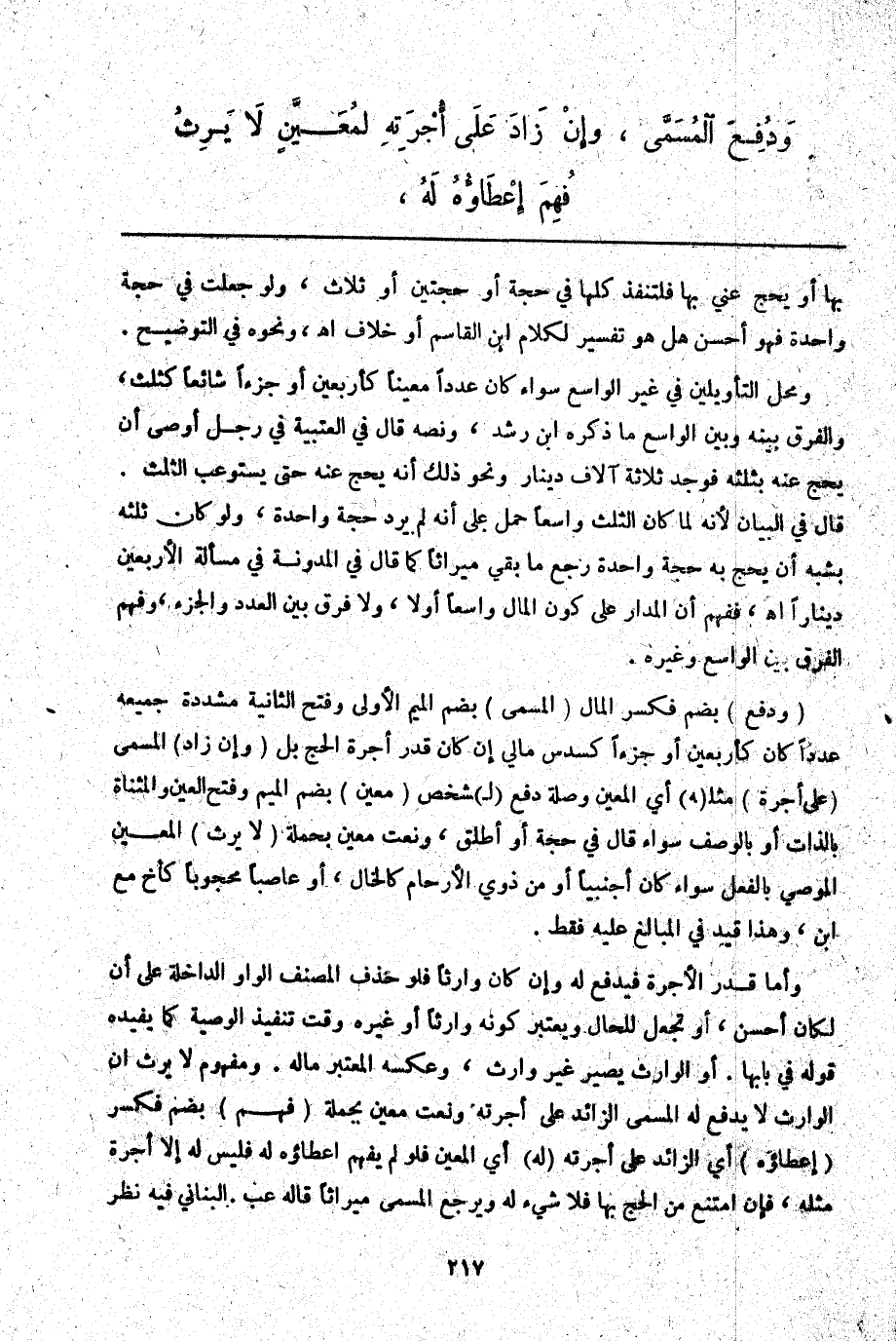 وَأَمَّا قَدْرُ الْأُجْرَةِ فَيُدْفَعُ لَهُ وَإِنْ كَانَ وَارِثًا فَلَوْ حَذَفَ الْمُصَنِّفُ الْوَاوَ الدَّاخِلَةَ عَلَى أَنْ لَكَانَ أَحْسَنَ، أَوْ تُجْعَلُ لِلْحَالِ وَيُعْتَبَرُ كَوْنُهُ وَارِثًا أَوْ غَيْرُهُ وَقْتُ تَنْفِيذِ الْوَصِيَّةِ كَمَا يُفِيدُهُ قَوْلُهُ فِي بَابِهَا. أَوْ الْوَارِثُ يَصِيرُ غَيْرَ وَارِثٍ، وَعَكْسُهُ الْمُعْتَبَرُ مَالُهُ. وَمَفْهُومُ لَا يَرِثُ أَنَّ الْوَارِثَ لَا يَدْفَعُ لَهُ الْمُسَمَّى الزَّائِدَ عَلَى أُجْرَتِهِ وَنَعَتَ مُعَيَّنٍ بِجُمْلَةِ (فُهِمَ) بِضَمٍّ فَكَسْرٍ (إعْطَاؤُهُ) أَيْ الزَّائِدَ عَلَى أُجْرَتِهِ (لَهُ) أَيْ: الْمُعَيَّنِ فَلَوْ لَمْ يُفْهَمْ إعْطَاؤُهُ لَهُ فَلَيْسَ لَهُ إلَّا أُجْرَةُ مِثْلِهِ، فَإِنْ امْتَنَعَ مِنْ الْحَجِّ بِهَا فَلَا شَيْءَ لَهُ وَيَرْجِعُ الْمُسَمَّى مِيرَاثًا قَالَهُ عب. الْبُنَانِيُّ فِيهِ نَظَرٌ