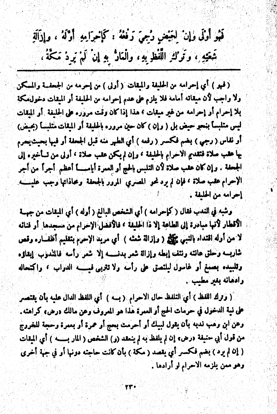 ـــــــــــــــــــــــــــــQفَهُوَ) أَيْ إحْرَامُهُ مِنْ الْحُلَيْفَةِ وَالْمِيقَاتِ (أَوْلَى) مِنْ إحْرَامِهِ مِنْ الْجُحْفَةِ وَالْمَسْكَنِ وَلَا وَاجِبَ؛ لِأَنَّ مِيقَاتَهُ أَمَامَهُ فَلَا يَلْزَمُ عَلَى عَدَمِ إحْرَامِهِ مِنْ الْحُلَيْفَةِ أَوْ الْمِيقَاتِ دُخُولُ مَكَّةَ بِلَا إحْرَامٍ أَوْ إحْرَامُهُ مِنْ غَيْرِ مِيقَاتٍ، هَذَا إذَا كَانَ وَقْتُ مُرُورِهِ عَلَى الْحُلَيْفَةِ أَوْ الْمِيقَاتُ لَيْسَ مُتَلَبِّسًا بِنَحْوِ حَيْضٍ بَلْ (وَإِنْ) كَانَ حِينَ مُرُورِهِ بِالْحُلَيْفَةِ أَوْ الْمِيقَاتِ مُتَلَبِّسًا (بِحَيْضٍ) أَوْ نِفَاسٍ (رُجِيَ) بِضَمٍّ فَكَسْرٍ (رَفْعُهُ) أَيْ الطُّهْرُ مِنْهُ قَبْلَ الْجُحْفَةِ أَوْ فِيهَا بِحَيْثُ يُحْرِمُ بِهَا عَقِبَ صَلَاةٍ فَتَقْدِيمُ الْإِحْرَامِ بِالْحُلَيْفَةِ، وَإِنْ لَمْ يَكُنْ عَقِبَ صَلَاةٍ، أَوْلَى مِنْ تَأْخِيرِهِ إلَى الْجُحْفَةِ. وَإِنْ كَانَ عَقِبَ صَلَاةٍ؛ لِأَنَّ التَّلَبُّسَ بِالْحَجِّ أَوْ الْعُمْرَةِ أَيَّامًا أَعْظَمُ أَجْرًا مِنْ أَجْرِ الْإِحْرَامِ عَقِبَ صَلَاةٍ، فَإِنْ لَمْ يُرِدْ نَحْوُ الْمِصْرِيِّ الْمُرُورَ بِالْجُحْفَةِ وَمُحَاذَاتَهَا وَجَبَ عَلَيْهِ إحْرَامُهُ مِنْ الْحُلَيْفَةِ.
