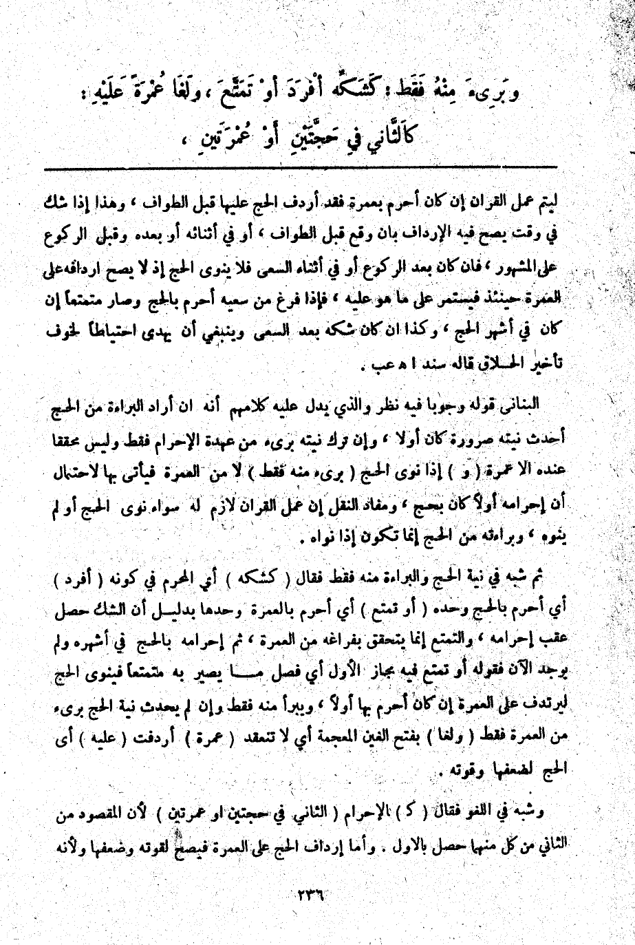 وَبَرِئَ مِنْهُ فَقَطْ: كَشَكِّهِ أَفْرَدَ أَوْ تَمَتَّعَ.
