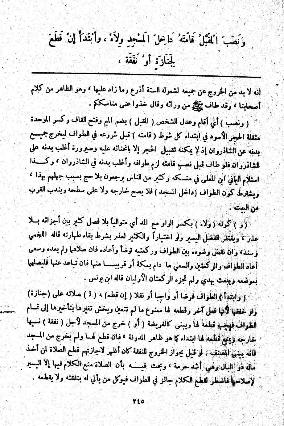 ـــــــــــــــــــــــــــــQأَنَّهُ لَا بُدَّ مِنْ الْخُرُوجِ عَنْ جَمِيعِهِ لِشُمُولِهِ السِّتَّةَ أَذْرُعٍ وَمَا زَادَ عَلَيْهَا، وَهُوَ الظَّاهِرُ مِنْ كَلَامِ أَصْحَابِنَا، وَقَدْ طَافَ - صَلَّى اللَّهُ عَلَيْهِ وَسَلَّمَ - مِنْ وَرَائِهِ وَقَالَ «خُذُوا عَنِّي مَنَاسِكَكُمْ» .