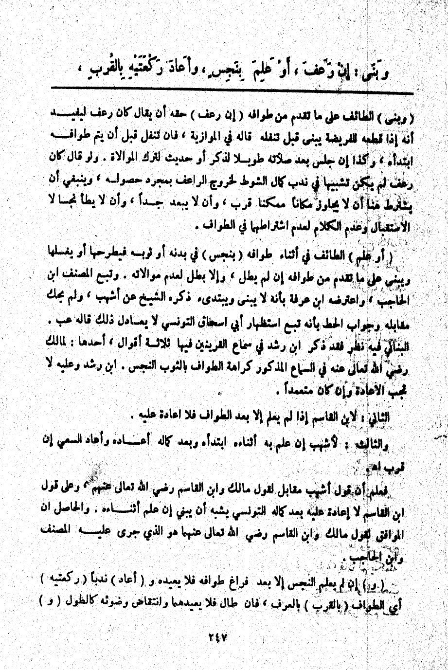 أَحَدُهَا: لِمَالِكٍ - رَضِيَ اللَّهُ تَعَالَى عَنْهُ - فِي السَّمَاعِ الْمَذْكُورِ كَرَاهَةُ الطَّوَافِ بِالثَّوْبِ النَّجَسِ. ابْنُ رُشْدٍ وَعَلَيْهِ لَا تَجِبُ الْإِعَادَةُ وَإِنْ كَانَ مُتَعَمِّدًا.
