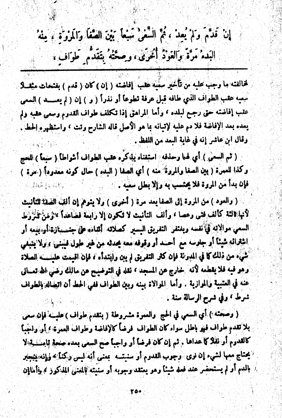 (وَصِحَّتُهُ) أَيْ السَّعْيِ فِي الْحَجِّ وَالْعُمْرَةِ مَشْرُوطَةٌ (بِتَقَدُّمِ طَوَافٍ) عَلَيْهِ فَإِنْ سَعَى بِلَا تَقَدُّمِ طَوَافٍ فَهُوَ بَاطِلٌ سَوَاءٌ كَانَ الطَّوَافُ فَرْضًا كَالْإِفَاضَةِ وَطَوَافِ الْعُمْرَةِ، أَوْ وَاجِبًا كَالْقُدُومِ أَوْ نَفْلًا كَمَا عَدَاهَا. ثُمَّ إنْ كَانَ فَرْضًا أَوْ وَاجِبًا صَحَّ السَّعْيُ بَعْدَ صِحَّةٍ تَامَّةٍ لَا يَحْتَاجُ مَعَهَا لِشَيْءٍ إنْ نَوَى وُجُوبَ الْقُدُومِ أَوْ سُنِّيَّتَهُ بِمَعْنَى أَنَّهُ لَيْسَ رُكْنًا، وَأَنَّهُ يَنْجَبِرُ بِالدَّمِ أَوْ لَمْ يَسْتَحْضِرْ عِنْدَ فِعْلِهِ شَيْئًا وَهُوَ يَعْتَقِدُ وُجُوبَهُ أَوْ سُنِّيَّتَهُ بِالْمَعْنَى الْمَذْكُورِ، وَأَمَّا إنْ