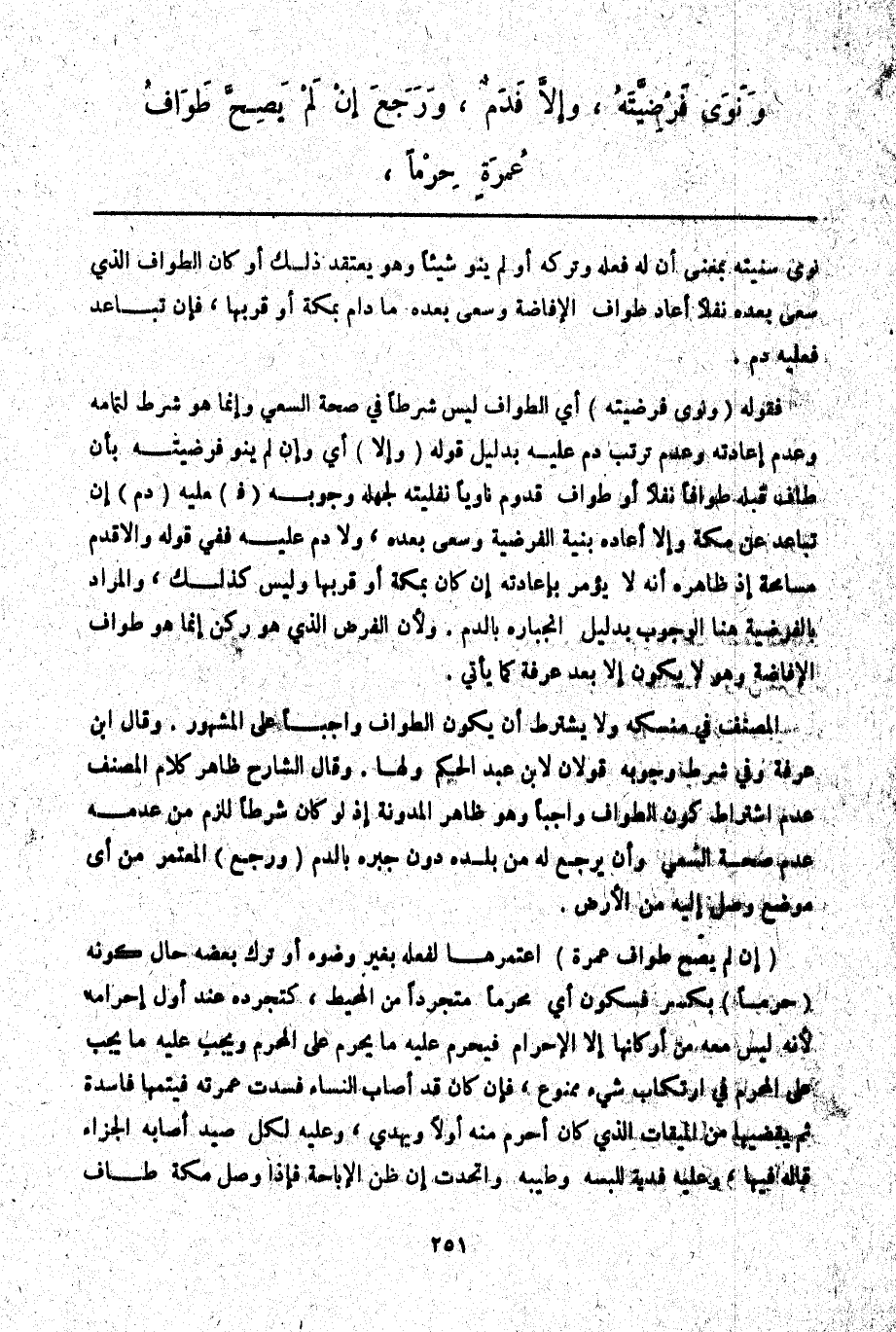 وَنَوَى فَرْضِيَّتَهُ، وَإِلَّا فَدَمٌ، وَرَجَعَ إنْ لَمْ يَصِحَّ طَوَافُ عُمْرَةٍ حِرْمًا،