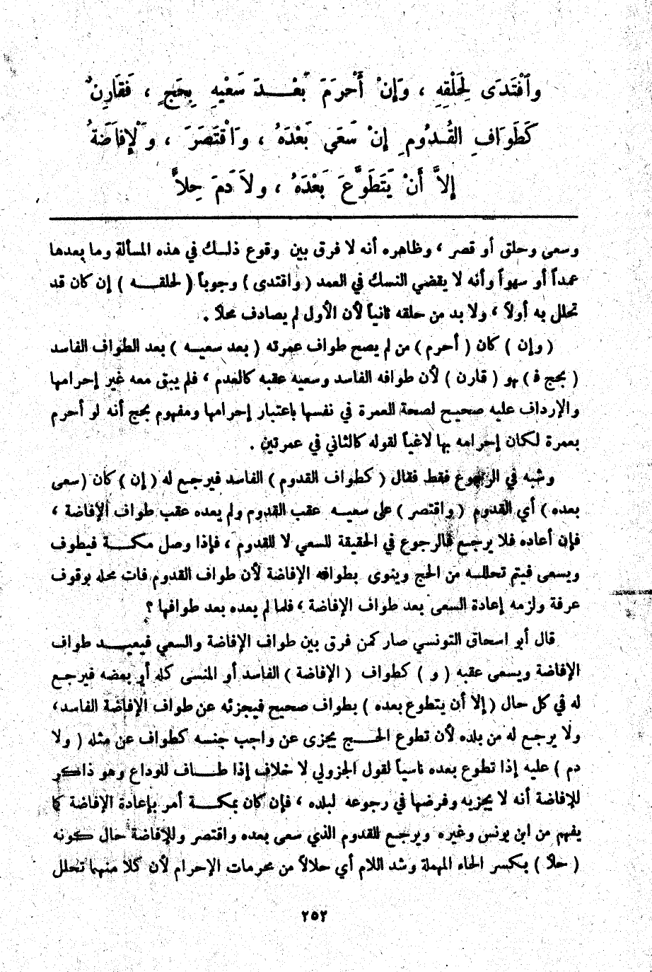 وَشَبَّهَ فِي الرُّجُوعِ فَقَطْ فَقَالَ (كَطَوَافِ الْقُدُومِ) الْفَاسِدِ فَيَرْجِعُ لَهُ (إنْ) كَانَ (سَعَى بَعْدَهُ) أَيْ: الْقُدُومِ (وَاقْتَصَرَ) عَلَى سَعْيِهِ عَقِبَ الْقُدُومِ وَلَمْ يُعِدْهُ عَقِبَ طَوَافِ الْإِفَاضَةِ، فَإِنْ أَعَادَهُ فَلَا يَرْجِعُ فَالرُّجُوعُ فِي الْحَقِيقَةِ لِلسَّعْيِ لَا لِلْقُدُومِ، فَإِذَا وَصَلَ مَكَّةَ فَيَطُوفُ وَيَسْعَى فَيُتِمُّ تَحَلُّلَهُ مِنْ الْحَجِّ وَيَنْوِي بِطَوَافِهِ الْإِفَاضَةَ؛ لِأَنَّ طَوَافَ الْقُدُومِ فَاتَ مَحَلُّهُ بِوُقُوفِ عَرَفَةَ وَلَزِمَهُ إعَادَةُ السَّعْيِ يُعِدْ طَوَافَ الْإِفَاضَةِ، فَلَمَّا لَمْ يُعِدْهُ بَعْدَ طَوَافِهَا