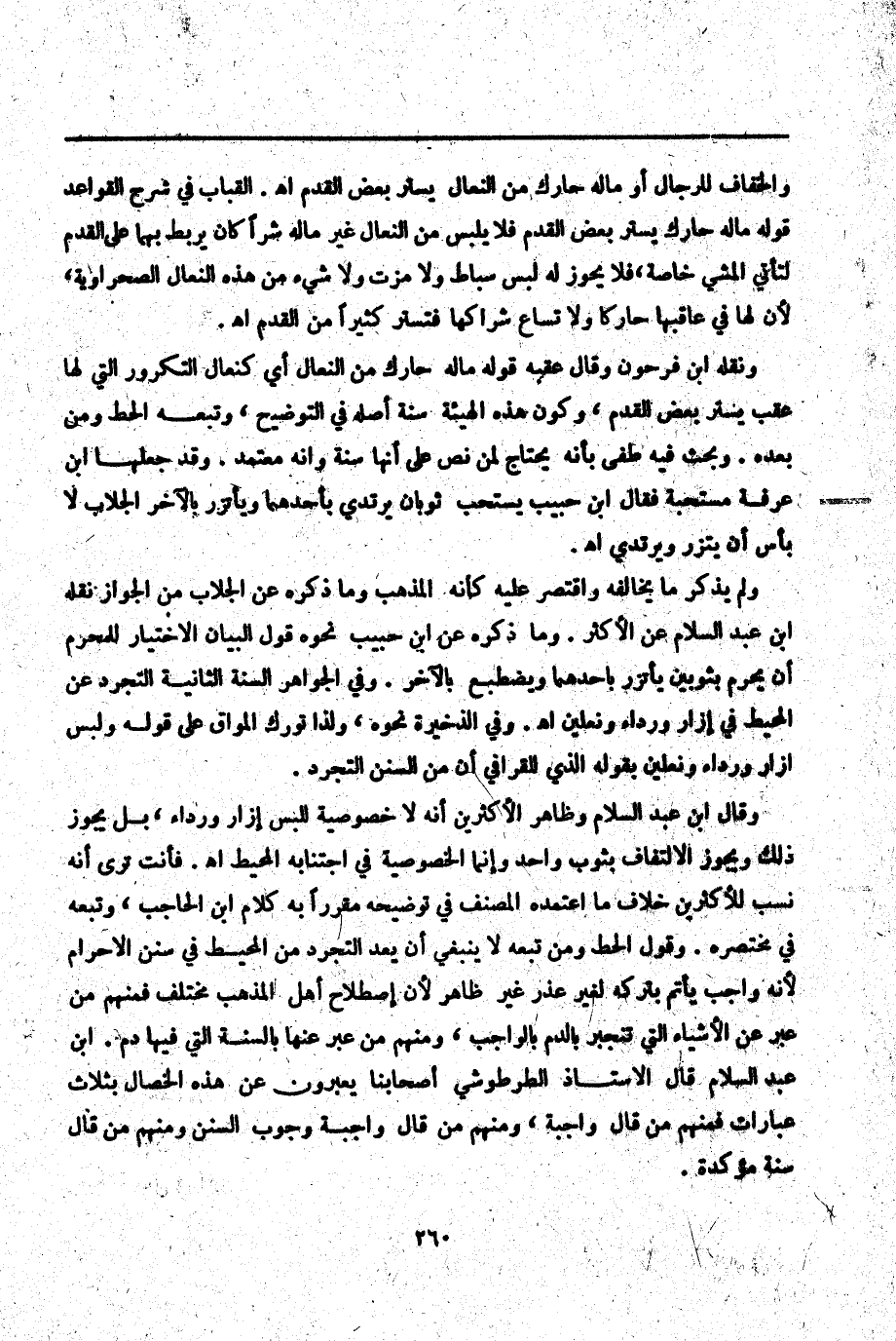 وَنَقَلَهُ ابْنُ فَرْحُونٍ وَقَالَ عَقِبَهُ قَوْلُهُ مَا لَهُ حَارِكٌ مِنْ النِّعَالِ أَيْ: كَنِعَالِ التَّكْرُورِ الَّتِي لَهَا عَقِبٌ يَسْتُرُ بَعْضَ الْقَدَمِ، وَكَوْنُ هَذِهِ الْهَيْئَةِ سُنَّةً أَصْلُهُ فِي التَّوْضِيحِ، وَتَبِعَهُ الْحَطّ وَمَنْ بَعْدَهُ، وَبَحَثَ فِيهِ طفي بِأَنَّهُ يَحْتَاجُ لِمَنْ نَصَّ عَلَى أَنَّهَا سُنَّةٌ وَأَنَّهُ مُعْتَمَدٌ. وَقَدْ جَعَلَهَا ابْنُ عَرَفَةَ مُسْتَحَبَّةً فَقَالَ ابْنُ حَبِيبٍ يُسْتَحَبُّ ثَوْبَانِ يَرْتَدِي بِأَحَدِهِمَا وَيَأْتَزِرُ الْآخَرُ الْجَلَّابُ لَا بَأْسَ أَنْ يَتَّزِرَ وَيَرْتَدِيَ اهـ
