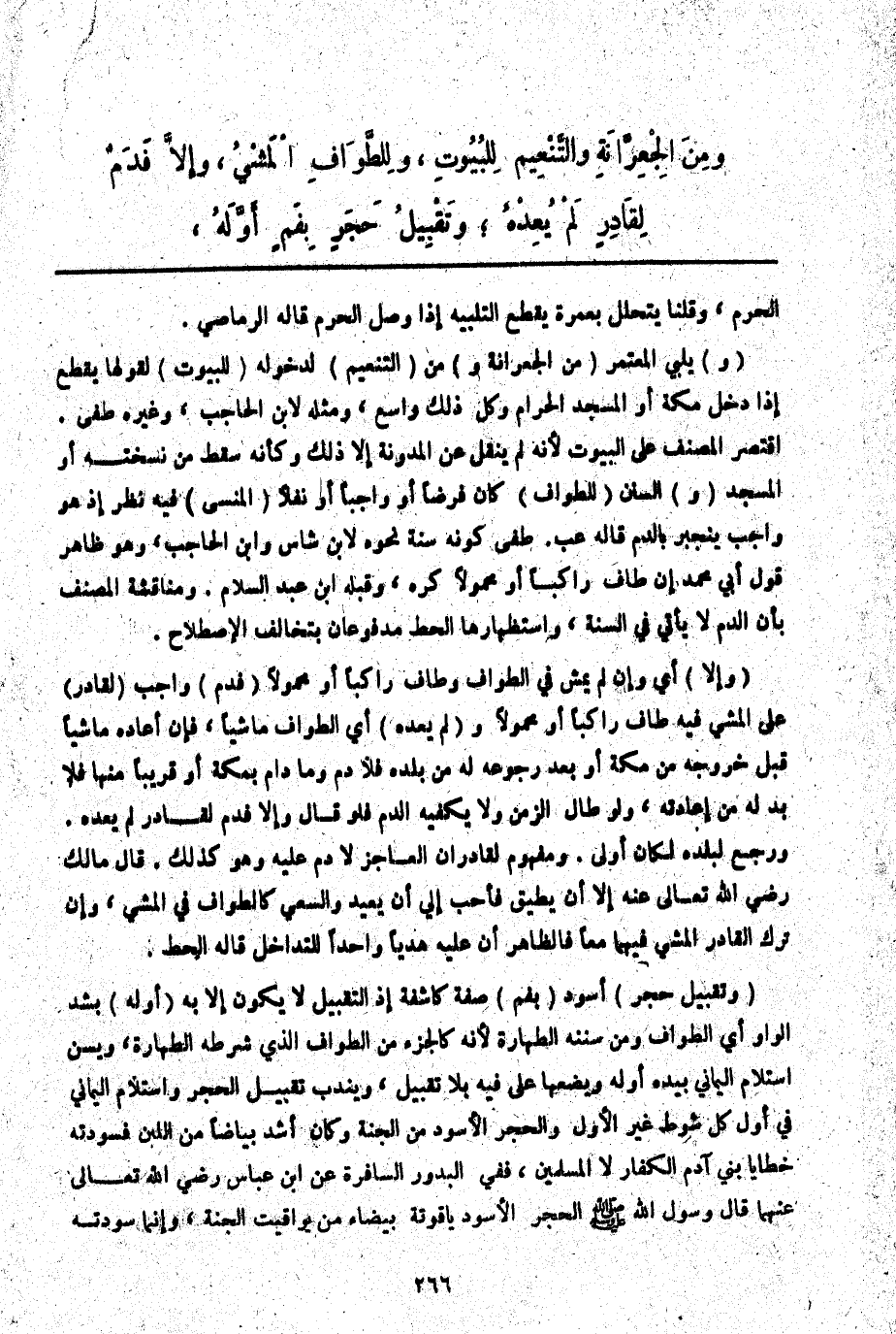 وَلِلطَّوَافِ الْمَشْيُ، وَإِلَّا فَدَمٌ لِقَادِرٍ لَمْ يُعِدْهُ، وَتَقْبِيلُ حَجَرٍ بِفَمٍ أَوَّلَهُ،