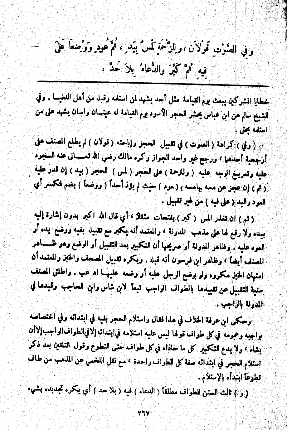 وَحَكَى ابْنُ عَرَفَةَ الْخِلَافَ فِي هَذَا فَقَالَ وَاسْتِلَامُ الْحَجَرِ بِفِيهِ فِي ابْتِدَائِهِ وَفِي اخْتِصَاصِهِ بِوَاجِبِهِ، وَعُمُومُهُ فِي كُلِّ طَوَافٍ قَوْلُهَا لَيْسَ عَلَيْهِ اسْتِلَامُهُ فِي ابْتِدَائِهِ إلَّا فِي الطَّوَافِ الْوَاجِبِ إلَّا أَنْ يَشَاءَ، وَلَا يَدَعَ التَّكْبِيرَ كُلُّ مَا حَاذَاهُ فِي كُلِّ طَوَافٍ حَتَّى التَّطَوُّعَ وَقَوْلُ التَّلْقِينِ بَعْدَ ذِكْرِ اسْتِلَامِ الْحَجَرِ فِي ابْتِدَائِهِ صِفَةُ كُلِّ الطَّوَافِ وَاحِدَةٌ، مَعَ نَقْلِ اللَّخْمِيِّ عَنْ الْمَذْهَبِ مَنْ طَافَ تَطَوُّعًا ابْتَدَأَهُ بِالِاسْتِلَامِ. (وَ) ثَالِثُ السُّنَنِ لِلطَّوَافِ مُطْلَقًا (الدُّعَاءُ) فِيهِ (بِلَا حَدٍّ) أَيْ: يُكْرَهَ تَحْدِيدُهُ بِشَيْءٍ