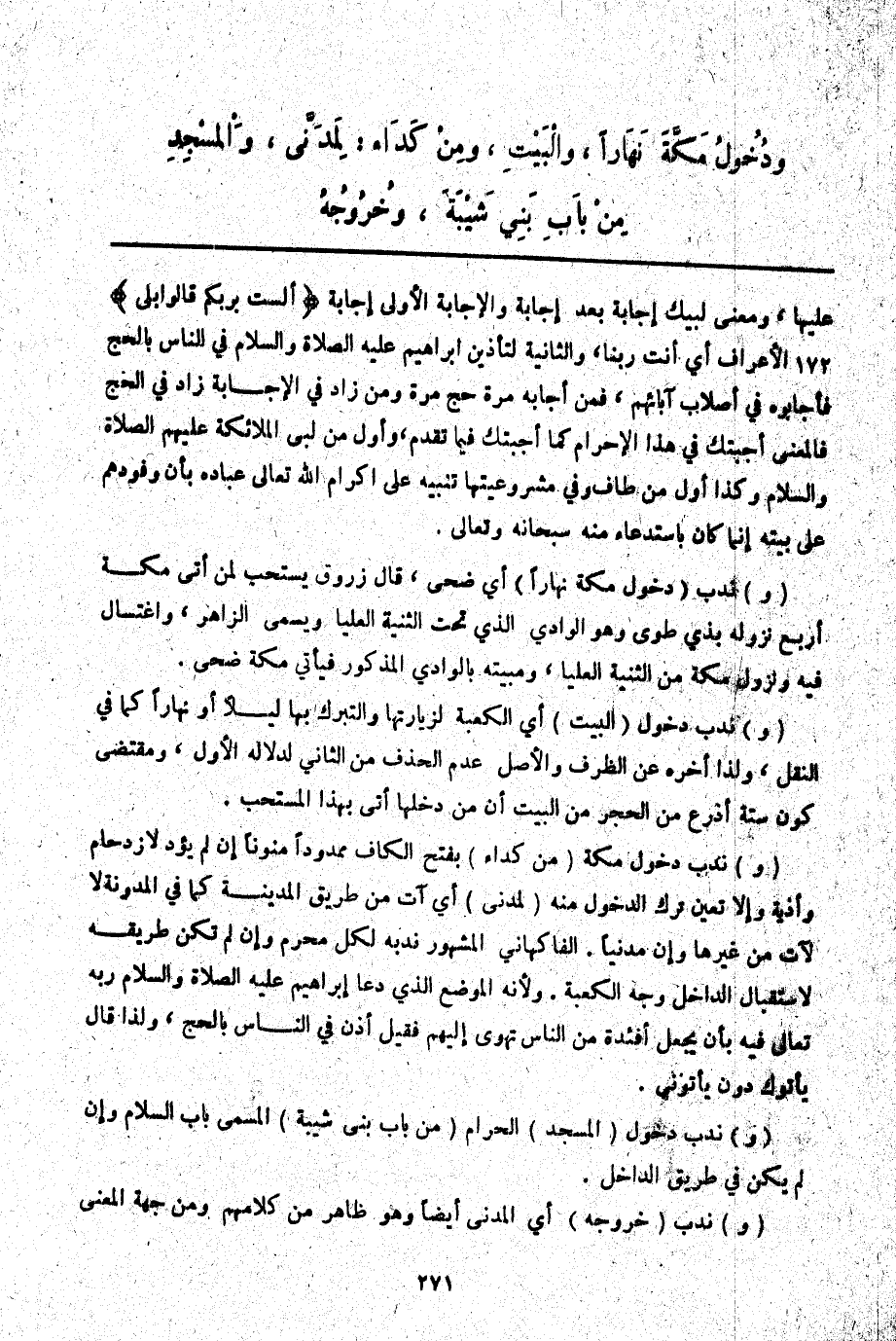 وَالْبَيْتِ، وَمِنْ كَدَاءَ: لِمَدَنِيٍّ، وَالْمَسْجِدِ مِنْ بَابِ بَنِي شَيْبَةَ، وَخُرُوجُهُ