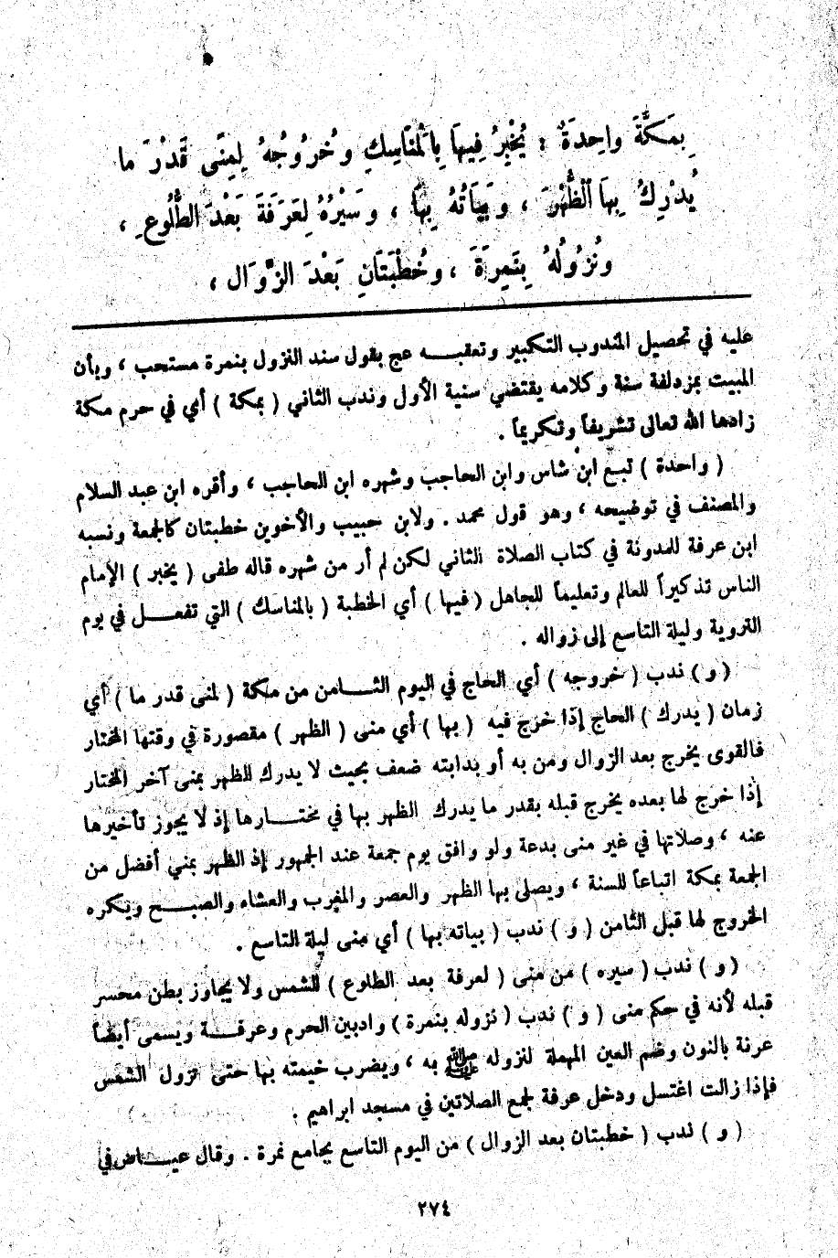 (وَ) نُدِبَ (خُرُوجُهُ) أَيْ: الْحَاجِّ فِي الْيَوْمِ الثَّامِنِ مِنْ مَكَّةَ (لِمِنًى قَدْرَ مَا) أَيْ: زَمَانِ (يُدْرِكُ) الْحَاجُّ إذَا خَرَجَ فِيهِ (بِهَا) أَيْ: مِنًى (الظُّهْرَ) مَقْصُورَةٌ فِي وَقْتِهَا الْمُخْتَارِ فَالْقَوِيُّ يَخْرُجُ بَعْدَ الزَّوَالِ وَمَنْ بِهِ أَوْ بِدَابَّتِهِ ضَعْفٌ بِحَيْثُ لَا يُدْرِكُ الظُّهْرَ بِمِنًى آخِرَ الْمُخْتَارِ إذَا خَرَجَ لَهَا بَعْدَهُ يَخْرُجُ قَبْلَهُ بِقَدْرِ مَا يُدْرِكُ الظُّهْرَ بِهَا فِي مُخْتَارِهَا؛ إذْ لَا يَجُوزُ تَأْخِيرُهَا عَنْهُ، وَصَلَاتُهَا فِي غَيْرِ مِنًى بِدْعَةٌ وَلَوْ وَافَقَ يَوْمَ جُمُعَةٍ عِنْدَ الْجُمْهُورِ؛ إذْ الظُّهْرُ بِمِنًى أَفْضَلُ مِنْ الْجُمُعَةِ بِمَكَّةَ اتِّبَاعًا لِلسُّنَّةِ، وَيُصَلِّي بِهَا الظُّهْرَ وَالْعَصْرَ وَالْمَغْرِبَ وَالْعِشَاءَ وَالصُّبْحَ وَيُكْرَهُ الْخُرُوجُ لَهَا قَبْلَ الثَّامِنِ (وَ) نُدِبَ (بَيَاتُهُ بِهَا) أَيْ: مِنًى لَيْلَةَ التَّاسِعِ.