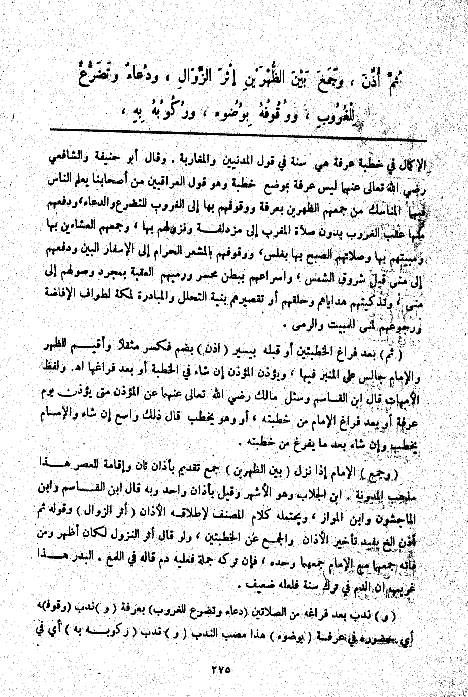 (وَ) نُدِبَ بَعْدَ فَرَاغِهِ مِنْ الصَّلَاتَيْنِ (دُعَاءٌ وَتَضَرُّعٌ لِلْغُرُوبِ) بِعَرَفَةَ (وَ) نُدِبَ (وُقُوفٌ) هـ أَيْ: حُضُورُهُ فِي عَرَفَةَ (بِوُضُوءٍ) هَذَا مَصَبُّ النَّدْبِ (وَ) نُدِبَ (رُكُوبُهُ بِهِ) أَيْ: فِي