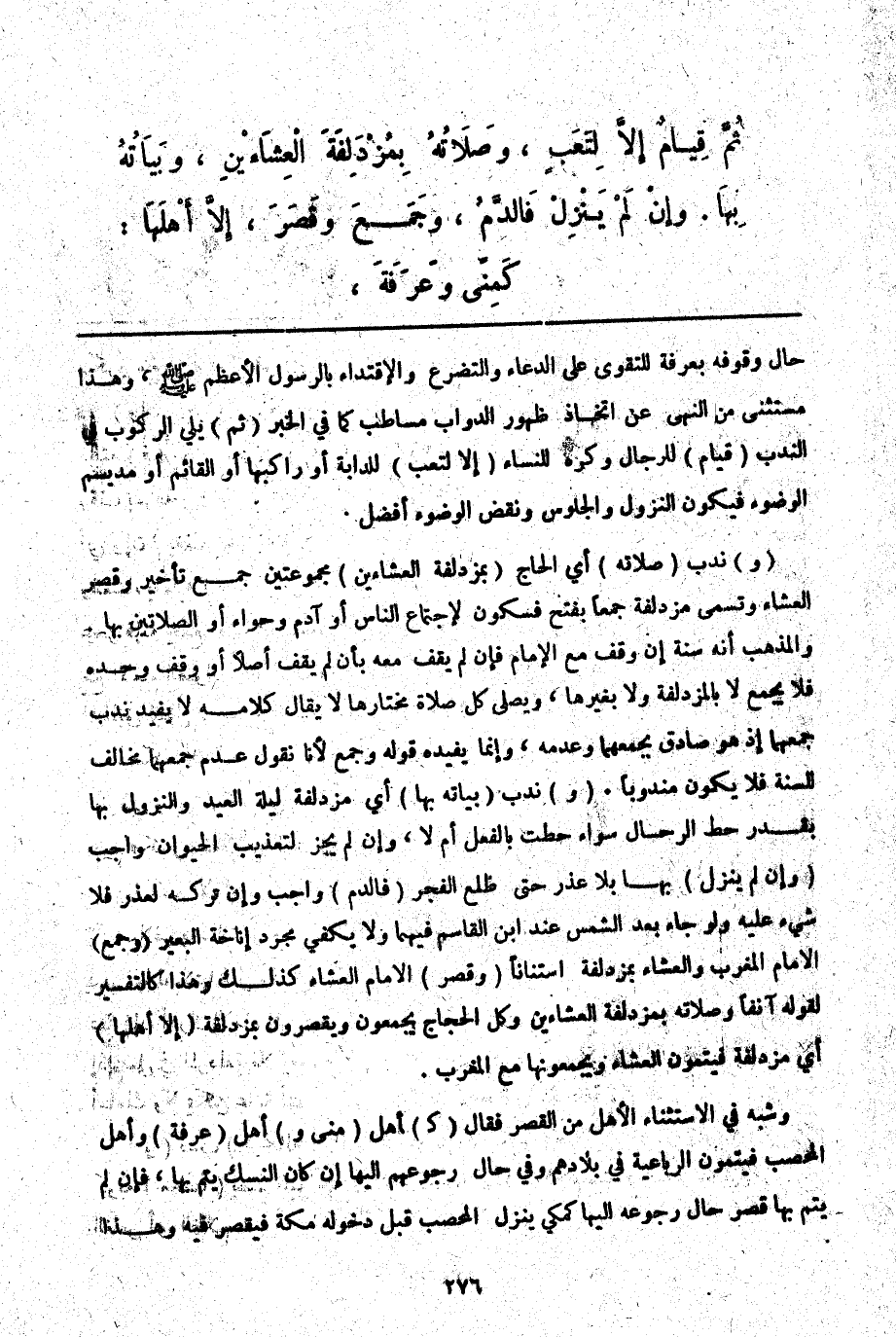 (وَ) نُدِبَ (صَلَاتُهُ) أَيْ: الْحَاجِّ (بِمُزْدَلِفَةَ الْعِشَاءَيْنِ) مَجْمُوعَتَيْنِ جَمْعَ تَأْخِيرٍ وَقَصْرُ الْعِشَاءِ وَتُسَمَّى مُزْدَلِفَةَ جَمْعًا بِفَتْحٍ فَسُكُونٍ لِاجْتِمَاعِ النَّاسِ أَوْ آدَمَ وَحَوَّاءَ أَوْ الصَّلَاتَيْنِ بِهَا. وَالْمَذْهَبُ أَنَّهُ سُنَّةٌ إنْ وَقَفَ مَعَ الْإِمَامِ فَإِنْ لَمْ يَقِفْ مَعَهُ بِأَنْ لَمْ يَقِفْ أَصْلًا أَوْ وَقَفَ وَحْدَهُ فَلَا يَجْمَعُ لَا بِالْمُزْدَلِفَةِ وَلَا بِغَيْرِهَا، وَيُصَلِّي كُلَّ صَلَاةٍ مُخْتَارَهَا لَا يُقَالُ كَلَامُهُ لَا يُفِيدُ نَدْبَ جَمْعِهِمَا؛ إذْ هُوَ صَادِقٌ يَجْمَعُهُمَا وَعَدَمُهُ وَإِنَّمَا يُفِيدُهُ قَوْلُهُ وَجَمْعٌ؛ لِأَنَّا نَقُولُ عَدَمُ جَمْعِهِمَا مُخَالِفٌ لِلسُّنَّةِ فَلَا يَكُونُ مَنْدُوبًا. (وَ) نُدِبَ (بَيَاتُهُ بِهَا) أَيْ: مُزْدَلِفَةَ لَيْلَةَ الْعِيدِ وَالنُّزُولِ بِهَا بِقَدْرِ حَطِّ الرِّحَالِ سَوَاءٌ حُطَّتْ بِالْفِعْلِ أَمْ لَا، وَإِنْ لَمْ يَجُزْ لِتَعْذِيبِ الْحَيَوَانِ وَاجِبٌ (وَإِنْ لَمْ يَنْزِلْ) بِهَا بِلَا عُذْرٍ حَتَّى طَلَعَ الْفَجْرُ (فَالدَّمُ) وَاجِبٌ وَإِنْ تَرَكَهُ لِعُذْرٍ فَلَا شَيْءَ عَلَيْهِ وَلَوْ جَاءَ بَعْدَ الشَّمْسِ عِنْدَ ابْنِ الْقَاسِمِ فِيهِمَا وَلَا يَكْفِي مُجَرَّدُ إنَاخَةِ الْبَعِيرِ (وَجَمَعَ) الْإِمَامُ الْمَغْرِبَ وَالْعِشَاءَ بِمُزْدَلِفَةَ اسْتِنَانًا (وَقَصَرَ) الْإِمَامُ الْعِشَاءَ كَذَلِكَ وَهَذَا كَالتَّفْسِيرِ لِقَوْلِهِ آنِفًا وَصَلَاتُهُ بِمُزْدَلِفَةَ الْعِشَاءَيْنِ وَكُلُّ الْحُجَّاجِ يَجْمَعُونَ وَيَقْصِرُونَ بِمُزْدَلِفَةَ (إلَّا أَهْلَهَا) أَيْ: مُزْدَلِفَةَ فَيُتِمُّونَ الْعِشَاءَ وَيَجْمَعُونَهَا مَعَ الْمَغْرِبِ.