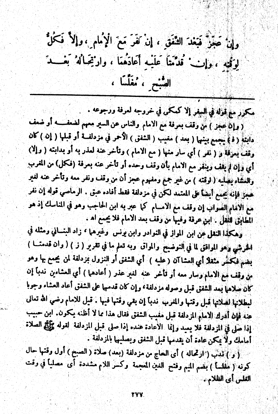 ـــــــــــــــــــــــــــــQمُكَرَّرٌ مَعَ قَوْلِهِ فِي السَّفَرِ إلَّا كَمَكِّيٍّ فِي خُرُوجِهِ لِعَرَفَةَ وَرُجُوعِهِ. (وَإِنْ عَجَزَ) مَنْ وَقَفَ بِعَرَفَةَ مَعَ الْإِمَامِ وَالنَّاسُ عَنْ السَّيْرِ مَعَهُمْ لِضَعْفِهِ أَوْ ضَعْفِ دَابَّتِهِ (فَ) يَجْمَعُ بَيْنَهُمَا (بَعْدَ) مَغِيبِ (الشَّفَقِ) الْأَحْمَرِ فِي مُزْدَلِفَةَ أَوْ قَبْلَهَا (إنْ) كَانَ وَقَفَ بِعَرَفَةَ وَ (نَفَرَ) أَيْ: سَارَ مِنْهَا (مَعَ الْإِمَامِ) وَتَأَخَّرَ عَنْهُ لِعُذْرٍ بِهِ أَوْ بِدَابَّتِهِ (وَإِلَّا) أَيْ: وَإِنْ لَمْ يَقِفْ وَيَنْفِرْ مَعَ الْإِمَامِ بِأَنْ وَقَفَ وَحْدَهُ أَوْ تَأَخَّرَ عَنْهُ بِعَرَفَةَ (فَكُلٌّ) مِنْ الْمَغْرِبِ وَالْعِشَاءِ يُصَلِّيهِ (لِوَقْتِهِ) مِنْ غَيْرِ جَمْعٍ وَمَفْهُومُ عَجَزَ أَنَّ مَنْ وَقَفَ وَنَفَرَ مَعَهُ وَتَأَخَّرَ عَنْهُ لِغَيْرِ عَجْزٍ فَإِنَّهُ يَجْمَعُ أَيْضًا عَلَى الْمُعْتَمَدِ لَكِنْ فِي مُزْدَلِفَةَ فَقَطْ أَفَادَهُ عبق الرَّمَاصِيُّ قَوْلُهُ إنْ نَفَرَ مَعَ الْإِمَامِ الصَّوَابُ إنْ وَقَفَ مَعَ الْإِمَامِ كَمَا عَبَّرَ بِهِ ابْنُ الْحَاجِبِ وَهُوَ فِي الْمَنَاسِكِ؛ إذْ هُوَ الْمُطَابِقُ لِلنَّقْلِ. ابْنُ عَرَفَةَ وَفِيهَا مَنْ وَقَفَ بَعْدَ الْإِمَامِ فَلَا يَجْمَعُ اهـ.