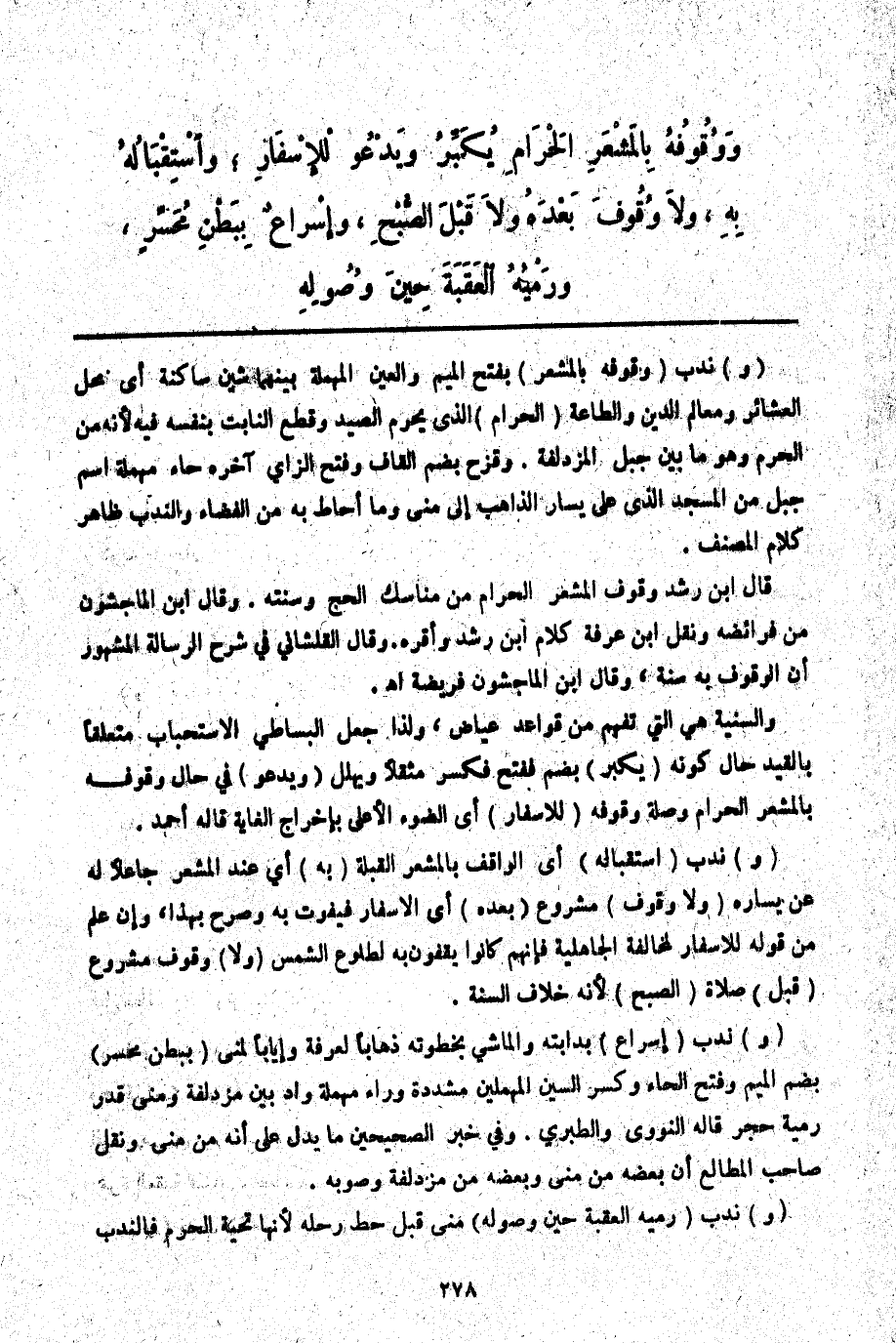 وَوُقُوفُهُ بِالْمَشْعَرِ الْحَرَامِ يُكَبِّرُ وَيَدْعُو لِلْإِسْفَارِ، وَاسْتِقْبَالُهُ بِهِ، وَلَا وُقُوفَ بَعْدَهُ وَلَا قَبْلَ الصُّبْحِ، وَإِسْرَاعٌ بِبَطْنِ مُحَسِّرٍ.