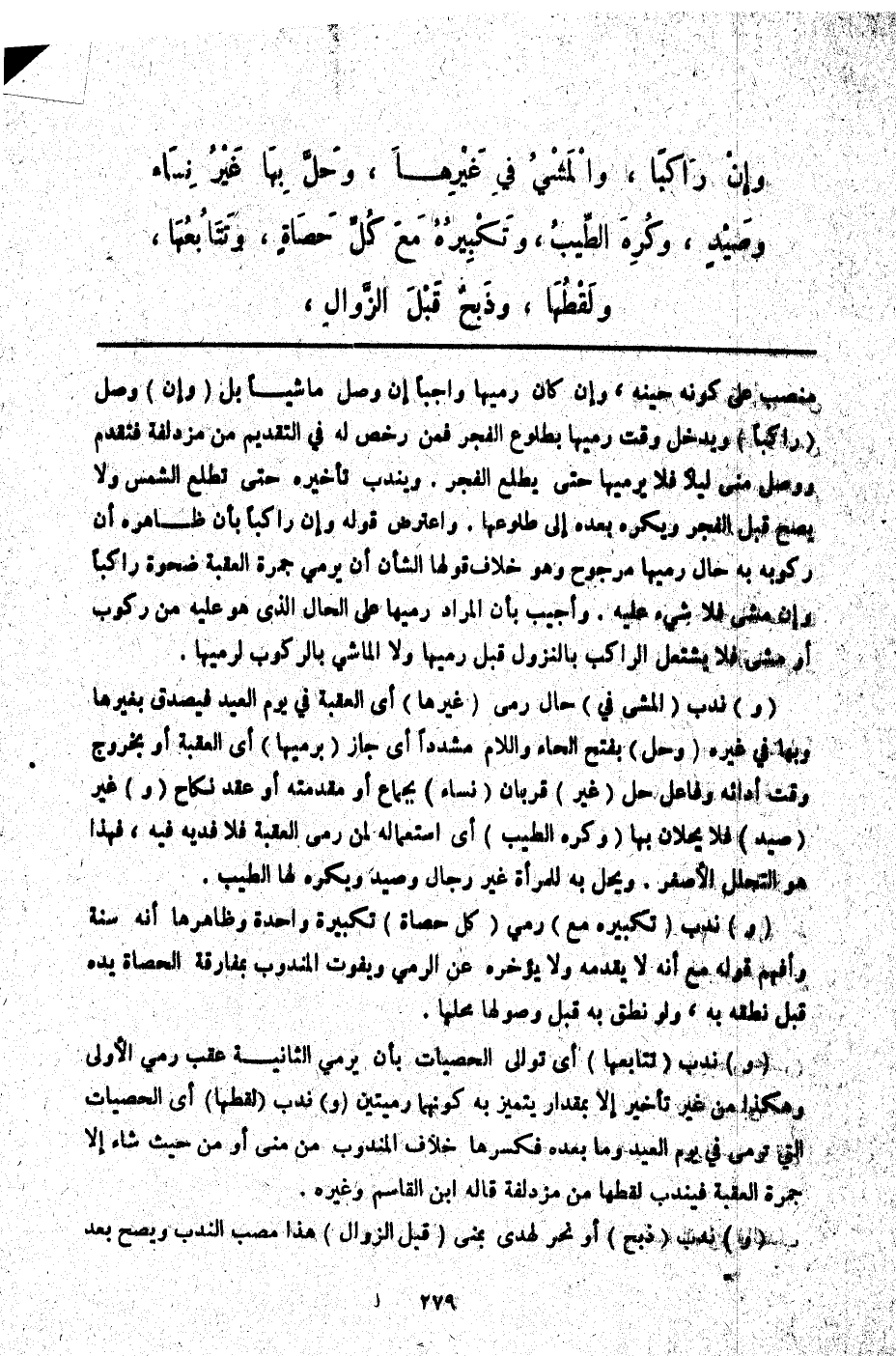 (وَ) نُدِبَ (الْمَشْيُ فِي) حَالِ رَمْيِ (غَيْرِهَا) أَيْ الْعَقَبَةِ فِي يَوْمِ الْعِيدِ فَيَصْدُقُ بِغَيْرِهَا وَبِهَا فِي غَيْرِهِ (وَحَلَّ) بِفَتْحِ الْحَاءِ وَاللَّامِ مُشَدَّدًا أَيْ: جَازَ (بِرَمْيِهَا) أَيْ: الْعَقَبَةَ أَوْ بِخُرُوجِ وَقْتِ أَدَائِهِ وَفَاعِلُ حَلَّ (غَيْرُ) قُرْبَانِ (نِسَاءٍ) بِجِمَاعٍ أَوْ مُقَدِّمَتِهِ أَوْ عَقْدُ نِكَاحٍ (وَ) غَيْرُ (صَيْدٍ) فَلَا يَحِلَّانِ بِهَا.