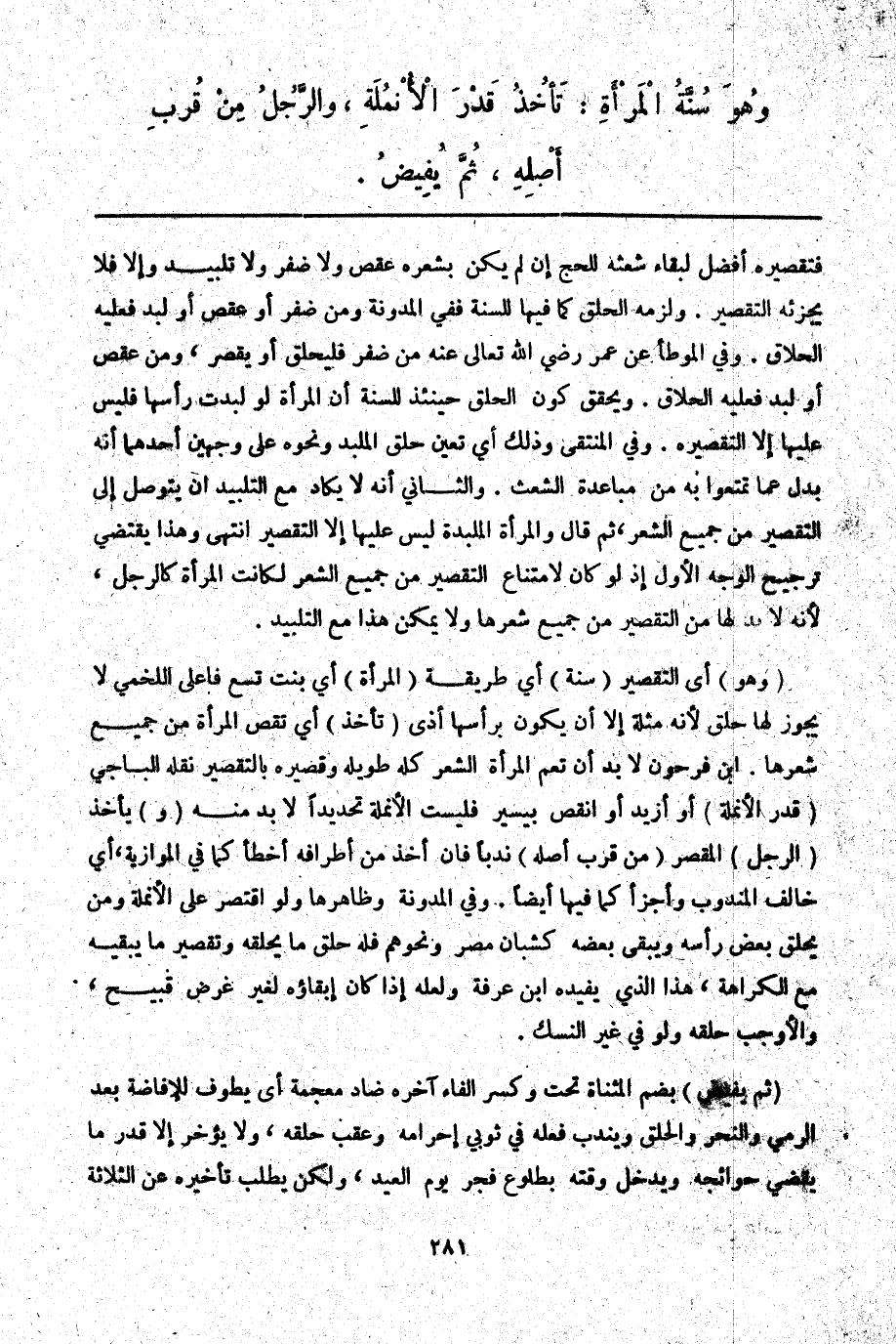 وَهُوَ سُنَّةُ الْمَرْأَةِ: تَأْخُذُ قَدْرَ الْأُنْمُلَةِ، وَالرَّجُلُ مِنْ قُرْبِ أَصْلِهِ، ثُمَّ يُفِيضُ. .
