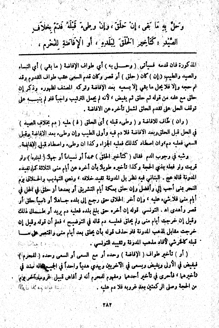 وَشَبَّهَ فِي وُجُوبِ الدَّمِ فَقَالَ (كَتَأْخِيرِ الْحَلْقِ) عَمْدًا أَوْ نِسْيَانًا أَوْ جَهْلًا (لِبَلَدِهِ) وَلَوْ قَرُبَتْ وَلَوْ فَعَلَهُ بِذِي الْحِجَّةِ وَكَذَا تَأْخِيرُهُ طَوِيلًا بِأَنْ أَخَّرَهُ عَنْ أَيَّامِ مِنًى الثَّلَاثَةِ كَمَا تُفِيدُهُ الْمُدَوَّنَةُ قَالَهُ عج. الْبُنَانِيُّ فِيهِ نَظَرٌ بَلْ الْمُدَوَّنَةُ تُفِيدُ خِلَافَهُ، وَنَصُّ التَّهْذِيبِ وَالْحِلَاقُ يَوْمَا النَّحْرِ بِمِنًى أَحَبُّ إلَيَّ وَأَفْضَلُ وَإِنْ حَلَقَ بِمَكَّةَ أَيَّامَ التَّشْرِيقِ أَوْ بَعْدَهَا أَوْ حَلَقَ فِي الْحِلِّ فِي أَيَّامِ مِنًى فَلَا شَيْءَ عَلَيْهِ، وَإِنْ أَخَّرَ الْحِلَاقَ حَتَّى رَجَعَ إلَى بَلَدِهِ جَاهِلًا أَوْ نَاسِيًا حَلَقَ أَوْ قَصَّرَ وَأَهْدَى اهـ. التُّونُسِيُّ قَوْلُهُ إنْ أَخَّرَهُ حَتَّى بَلَغَ بَلَدَهُ فَعَلَيْهِ دَمٌ يُرِيدُ أَوْ طَالَ ذَلِكَ وَقِيلَ: إنْ خَرَجَتْ أَيَّامُ مِنًى وَلَمْ يَحْلِقْ فَعَلَيْهِ دَمٌ قَالَهُ فِي التَّوْضِيحِ، فَعُلِمَ أَنَّ قَوْلَهُ وَقِيلَ إنْ خَرَجَتْ مُقَابِلٌ لِمَذْهَبِ الْمُدَوَّنَةِ فَلَوْ حُذِفَ قَوْلُهُ بِأَنْ يَحْلِقَ بَعْدَ أَيَّامِ مِنًى وَاقْتَصَرَ عَلَى مَا قَبْلَهُ كَالْخَرَشِيِّ لَأَفَادَ مَذْهَبُ الْمُدَوَّنَةِ وَتَقْيِيدُ التُّونُسِيِّ.