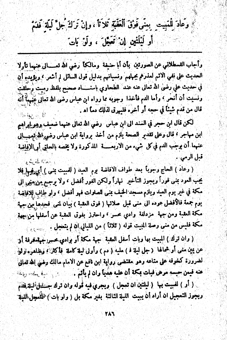 (وَإِنْ تَرَكَ) الْمَبِيتَ بِهَا وَبَاتَ أَسْفَلَ الْعَقَبَةِ جِهَةَ مَكَّةَ أَوْ بِوَادِي مُحَسِّرٍ جِهَةَ عَرَفَةَ أَوْ عَنْ يَمِينِ مِنًى أَوْ شِمَالِهَا (جُلَّ لَيْلَةٍ فَ) عَلَيْهِ (دَمٌ) وَأَوْلَى لَيْلَةً كَامِلَةً فَأَكْثَرَ، وَظَاهِرُهُ وَلَوْ لِضَرُورَةٍ كَخَوْفِهِ عَلَى مَتَاعِهِ وَهُوَ مُقْتَضَى رِوَايَةِ ابْنِ نَافِعٍ عَنْ الْإِمَامِ مَالِكٍ - رَضِيَ اللَّهُ تَعَالَى عَنْهُ - فِيمَنْ حَبَسَهُ مَرَضٌ فَبَاتَ بِمَكَّةَ أَنَّ عَلَيْهِ هَدْيًا وَإِنْ لَمْ يَأْثَمْ.