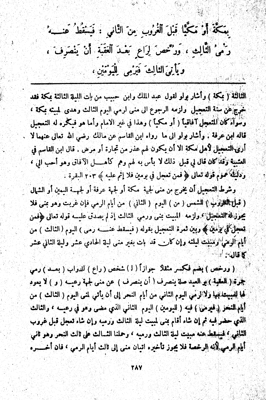 ـــــــــــــــــــــــــــــQالثَّالِثَةَ (بِمَكَّةَ) وَأَشَارَ بِوَلَوْ لِقَوْلِ عَبْدِ الْمَلِكِ وَابْنِ حَبِيبٍ مَنْ بَاتَ اللَّيْلَةَ الثَّالِثَةَ بِمَكَّةَ فَقَدْ خَرَجَ عَنْ سُنَّةِ التَّعْجِيلِ وَلَزِمَهُ الرُّجُوعُ إلَى مِنًى لِرَمْيِ الْيَوْمِ الثَّالِثِ وَهَدْيٍ لِمَبِيتِهِ بِمَكَّةَ، وَسَوَاءٌ كَانَ الْمُتَعَجِّلُ آفَاقِيًّا (أَوْ مَكِّيًّا) وَهَذَا فِي غَيْرِ الْإِمَامِ وَأَمَّا هُوَ فَيُكْرَهُ لَهُ التَّعْجِيلُ قَالَهُ ابْنُ عَرَفَةَ. وَأَشَارَ بِوَلَوْ إلَى مَا رَوَاهُ ابْنُ الْقَاسِمِ عَنْ مَالِكٍ - رَضِيَ اللَّهُ تَعَالَى عَنْهُمَا - لَا أَرَى التَّعْجِيلَ لِأَهْلِ مَكَّةَ إلَّا أَنْ يَكُونَ لَهُمْ عُذْرٌ مِنْ تِجَارَةٍ أَوْ مَرَضٍ. قَالَ ابْنُ الْقَاسِمِ فِي الْعُتْبِيَّةِ وَقَدْ كَانَ قَالَ لِي قَبْلَ ذَلِكَ لَا بَأْسَ بِهِ لَهُمْ وَهُمْ كَأَهْلِ الْآفَاقِ وَهُوَ أَحَبُّ إلَيَّ، وَدَلِيلُهُ عُمُومُ قَوْله تَعَالَى {فَمَنْ تَعَجَّلَ فِي يَوْمَيْنِ فَلا إِثْمَ عَلَيْهِ} [البقرة: 203] .