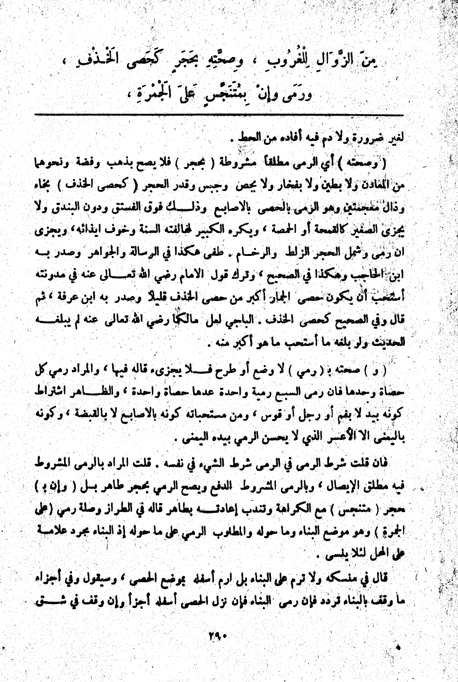 (وَصِحَّتُهُ) أَيْ: الرَّمْيِ مُطْلَقًا مَشْرُوطَةٌ (بِحَجَرِ) فَلَا يَصِحُّ بِذَهَبٍ وَفِضَّةٍ وَنَحْوِهِمَا مِنْ الْمَعَادِنِ وَلَا بِطِينٍ وَلَا بِفُخَّارٍ وَلَا بِجِصٍّ وَجِبْسٍ وَقَدْرُ الْحَجَرِ (كَحَصَى الْخَذْفِ) بِخَاءٍ وَذَالٍ مُعْجَمَتَيْنِ وَهُوَ الرَّمْيُ بِالْحَصَى بِالْأَصَابِعِ وَذَلِكَ فَوْقَ الْفُسْتُقِ وَدُونَ الْبُنْدُقِ وَلَا يَجْزِي الصَّغِيرُ كَالْقَمْحَةِ أَوْ الْحِمَّصَةِ، وَيُكْرَهُ الْكَبِيرُ لِمُخَالَفَتِهِ السُّنَّةَ وَخَوْفَ إيذَائِهِ، وَيَجْزِي إنْ رَمَى وَشَمِلَ الْحَجَرُ الزَّلَطَ وَالرُّخَامَ. طفي هَكَذَا فِي الرِّسَالَةِ وَالْجَوَاهِرِ وَصَدَّرَ بِهِ ابْنُ الْحَاجِبِ وَهَكَذَا فِي الصَّحِيحِ، وَتَرَكَ قَوْلَ الْإِمَامِ - رَضِيَ اللَّهُ تَعَالَى عَنْهُ - فِي مُدَوَّنَتِهِ اُسْتُحِبَّ أَنْ يَكُونَ حَصَى الْجِمَارِ أَكْبَرَ مِنْ حَصَى الْخَذْفِ قَلِيلًا وَصَدَّرَ بِهِ ابْنُ عَرَفَةَ، ثُمَّ قَالَ وَفِي الصَّحِيحِ كَحَصَى الْخَذْفِ. الْبَاجِيَّ لَعَلَّ مَالِكًا - رَضِيَ اللَّهُ تَعَالَى عَنْهُ - لَمْ يَبْلُغْهُ الْحَدِيثُ وَلَوْ بَلَغَهُ مَا اسْتَحَبَّ مَا هُوَ أَكْبَرُ مِنْهُ.