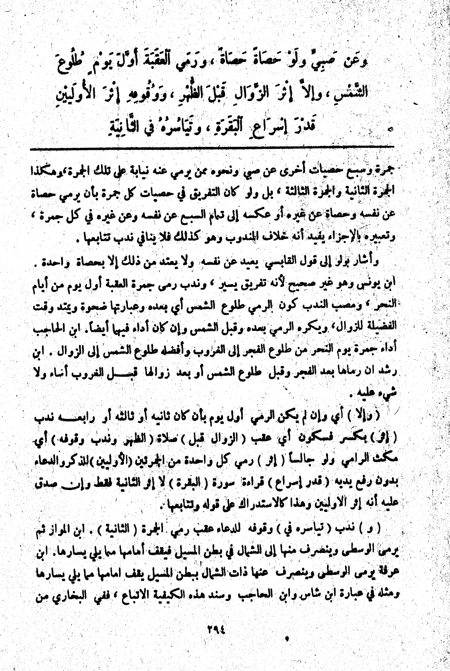 وَعَنْ صَبِيٍّ وَلَوْ حَصَاةً حَصَاةً، وَرَمْيُ الْعَقَبَةِ أَوَّلَ يَوْمٍ طُلُوعَ الشَّمْسِ، وَإِلَّا إثْرَ الزَّوَالِ قَبْلَ الظُّهْرِ، وَوُقُوفِهِ إثْرَ الْأُولَيَيْنِ قَدْرَ إسْرَاعِ الْبَقَرَةِ، وَتَيَاسُرِهِ فِي الثَّانِيَةِ.