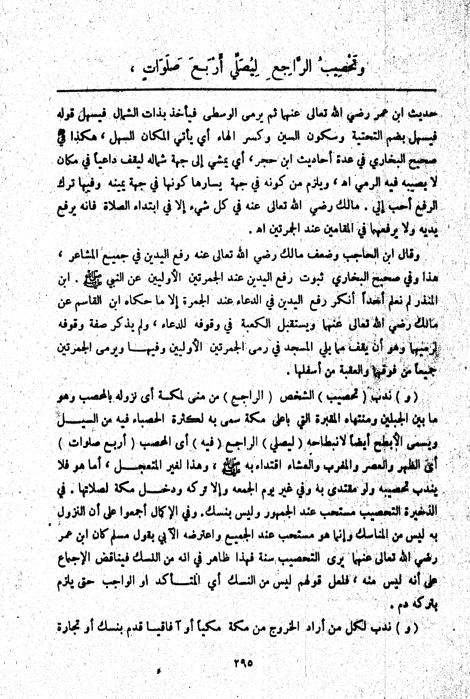 وَتَحْصِيبُ الرَّاجِعِ لِيُصَلِّيَ أَرْبَعَ صَلَوَاتٍ.