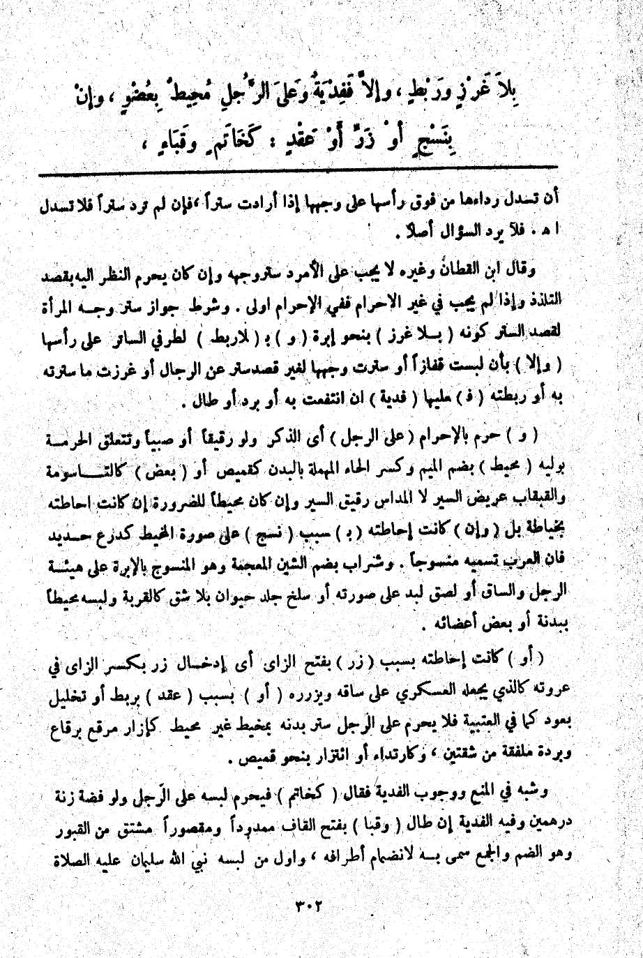 وَقَالَ ابْنُ الْقَطَّانِ وَغَيْرُهُ لَا يَجِبُ عَلَى الْأَمْرَدِ سَتْرُ وَجْهِهِ وَإِنْ كَانَ يَحْرُمُ النَّظَرُ إلَيْهِ بِقَصْدِ التَّلَذُّذِ وَإِذَا لَمْ يَجِبْ فِي غَيْرِ الْإِحْرَامِ فَفِي الْإِحْرَامِ أَوْلَى. وَشَرْطُ جَوَازِ سَتْرِ وَجْهِ الْمَرْأَةِ لِقَصْدِ السَّتْرِ كَوْنُهُ (بِلَا غَرْزٍ) بِنَحْوِ إبْرَةٍ (وَ) بِ (لَا رَبْطٍ) لِطَرَفَيْ السَّاتِرِ عَلَى رَأْسِهَا (وَإِلَّا) بِأَنْ لَبِسَتْ قُفَّازًا أَوْ سَتَرَتْ وَجْهَهَا لِغَيْرِ قَصْدِ سَتْرٍ عَنْ الرِّجَالِ أَوْ غَرَزَتْ مَا سَتَرَتْهُ بِهِ أَوْ رَبَطَتْهُ (فَ) عَلَيْهَا (فِدْيَةٌ) إنْ انْتَفَعَتْ بِهِ أَوْ بِرَدٍّ أَوْ طَالَ.